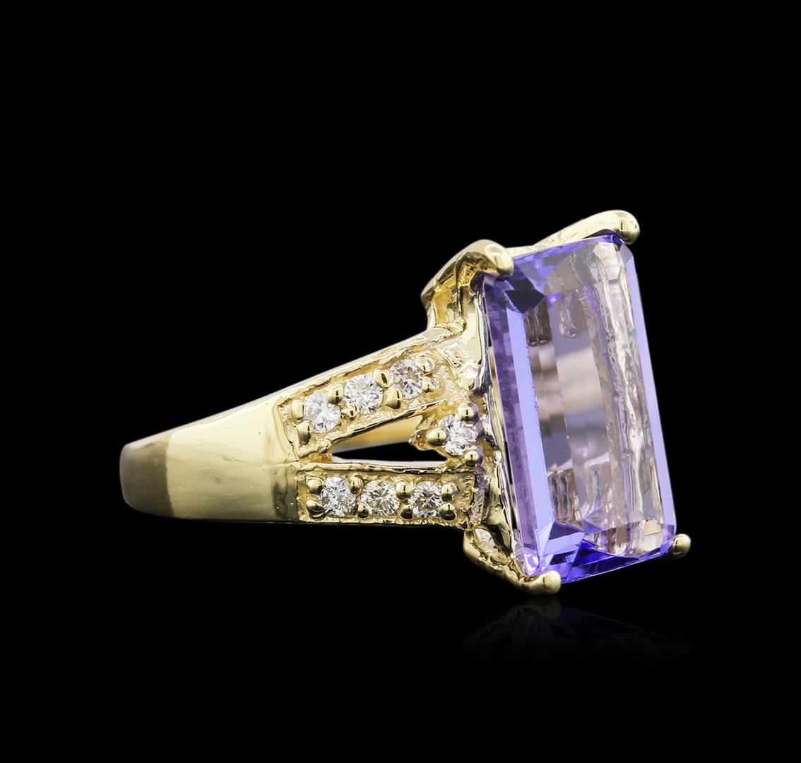 One ring featuring: 14KT yellow gold weighing 5.11 grams containing one tanzanite center stone with a total weight of 4.95ct and 14 diamonds with a total weight of 0.24ct.
