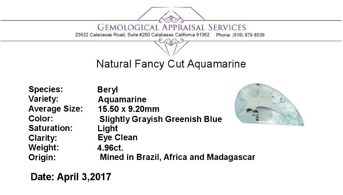 One natural fancy cut aquamarine with an exact weight of 4.96ct., clarity is eye clean, slightly grayish greenish blue, light. Gemological Appraisals Services estimates the retail value at $1413.6 GAS Appraised.