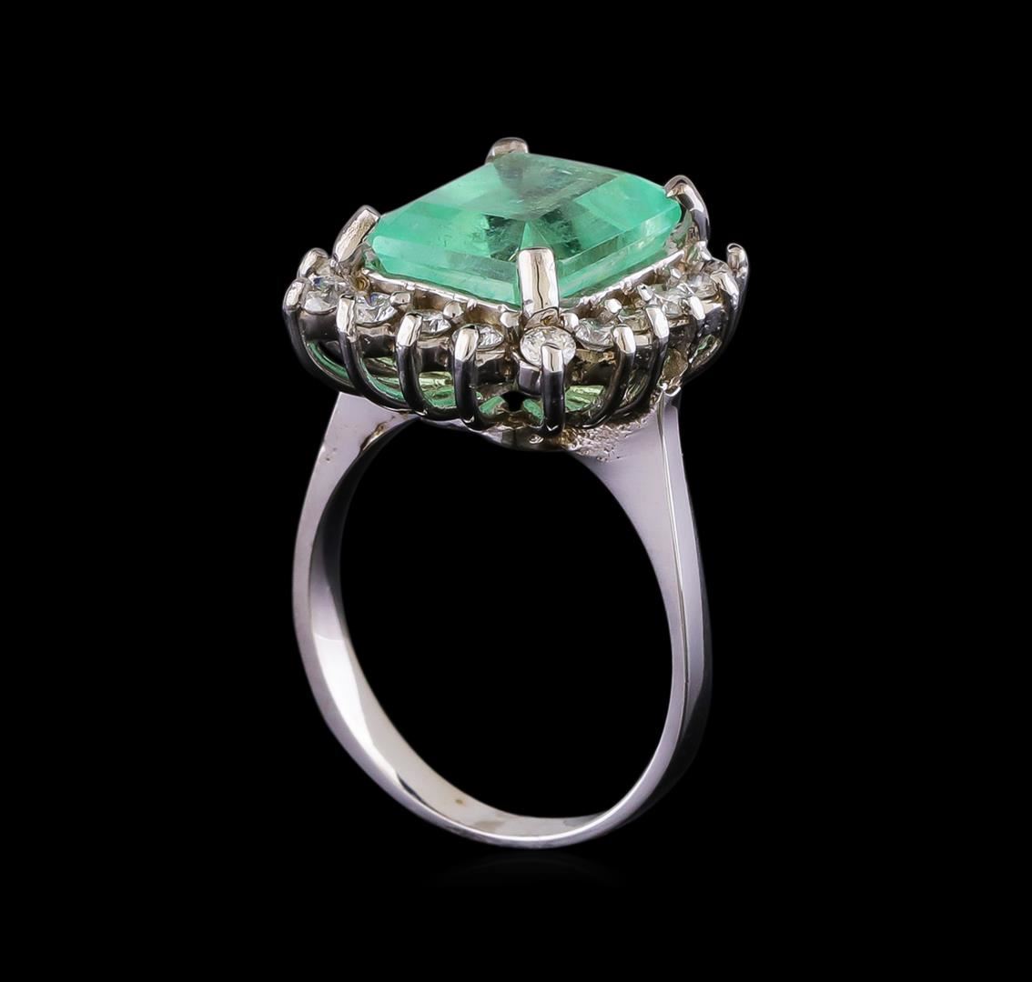 One electronically tested 14KT white gold lady's cast fashion ring with a basket halo with a bright polish finish. The featured lady's has a shank measuring 2.39 millimeters in width. Identified with markings of "14K". Condition is new, good workmanship. Containing: One prong set emerald step cut natural emerald, measuring 10.62 x 8.82 x 7.57mm, (depth est.) approximate weight of 4.96ct., clarity is moderately included, medium light, moderately strong, green color, (GIA G 4/4), cut is good. Transmitting light somewhat diffusely, transparent to translucent. Indications of oil residue. Naturally occurring internal & external characteristics are present. Colored gemstones are presumed to have been subjected to commonly used enhancement processes. Graded in the setting. Eighteen prong set round brilliant cut diamonds, measuring 2.10 - 2.00 x 1.27mm (depth est.) approximate total weight of 18 Stones = 0.60ct. Graded in the setting. Clarity: SI-1 to I-1. Color: I - J. Cut Good. Total Weight of Colored Stones 4.96ct. Total Weight of Diamonds 0.60ct. Total Weight of Ring 6.20gm. GAS Appraised.
