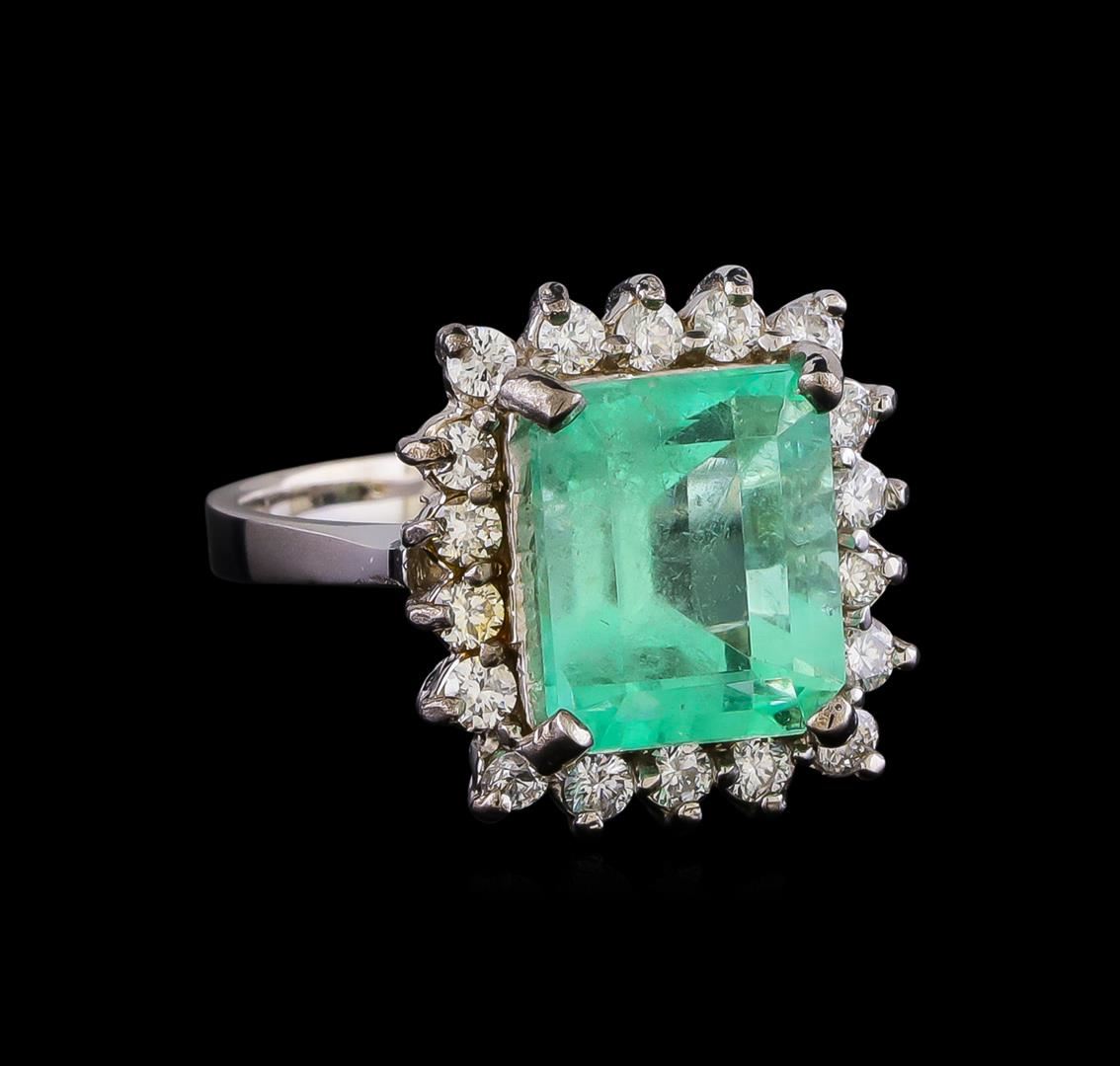 One electronically tested 14KT white gold lady's cast fashion ring with a basket halo with a bright polish finish. The featured lady's has a shank measuring 2.39 millimeters in width. Identified with markings of "14K". Condition is new, good workmanship. Containing: One prong set emerald step cut natural emerald, measuring 10.62 x 8.82 x 7.57mm, (depth est.) approximate weight of 4.96ct., clarity is moderately included, medium light, moderately strong, green color, (GIA G 4/4), cut is good. Transmitting light somewhat diffusely, transparent to translucent. Indications of oil residue. Naturally occurring internal & external characteristics are present. Colored gemstones are presumed to have been subjected to commonly used enhancement processes. Graded in the setting. Eighteen prong set round brilliant cut diamonds, measuring 2.10 - 2.00 x 1.27mm (depth est.) approximate total weight of 18 Stones = 0.60ct. Graded in the setting. Clarity: SI-1 to I-1. Color: I - J. Cut Good. Total Weight of Colored Stones 4.96ct. Total Weight of Diamonds 0.60ct. Total Weight of Ring 6.20gm. GAS Appraised.