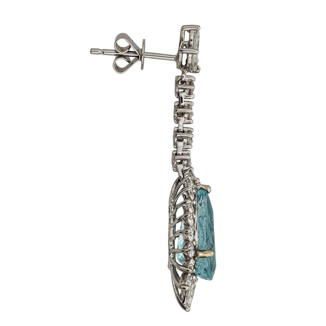 One pair of 18KT white gold earrings, weighing in total approx. 3.7 dwt., stamped: one "18K CJ 1.2.24", and "18K CJ 1.90", containing the following: Two natural tourmaline, pear shape modified brilliant, measuring approx. 11.50 x 6.50 x 5.00 mm, weight estimated at 2.48ct each, in total 4.96ct, color: greenish blue transparent - good, clarity: moderately included/heavily included, tone: light, brilliance: 35%, color uniformity: good, proportions: good. Twelve natural diamonds, marquise shape brilliant, measuring approx. 4.00 x 2.00 x 1.20 mm, weight estimated at 0.065ct each, in total 0.78ct, color: near colorless, clarity: SI2/I1, polish/symmetry: good/good. Thirty eight natural diamonds, round brilliant, measuring approx. 1.80 - 2.10 mm, weight estimated at 0.03ct each, in total 1.14ct, color: near colorless, clarity: SI2/I1, polish/symmetry: good/good. IGI Appraised at $23,155.00.