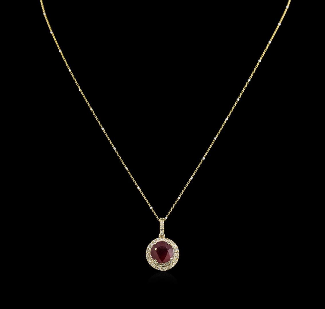 One electronically tested 14KT yellow gold lady's combination cast & assembled fashion pendant & chain 18.0" long, 1mm designer yellow and white gold cable link with a spring ring clasp with a double halo with a bright polish finish. Identified with markings of "14K". Condition is new, good workmanship. Containing: One prong set round modified brilliant cut natural ruby, measuring 9.80 - 9.76 x 5.78 mm, 10% bulge factor, approximate weight of 4.96ct., clarity is heavily included, type II, medium dark, very slightly brownish, orangy red color, (GIA oR 6/3), cut is good. Transmitting light somewhat diffusely, semi-transparent to translucent. Naturally occurring internal & external characteristics are present. Indications of laboratory high temperature heat treatment, with glass & flux additives. Graded in the setting. Forty-Eight split prong set round brilliant cut diamonds, measuring 1.50 - 1.45 x 0.95mm (depth est.) approximate total weight of 48 Stones = 0.60ct. Graded in the setting. Clarity: SI-2 to I-1. Color: I - Good. Total Weight of Colored Stones 4.96ct. Total Weight of Diamonds 0.60ct. Total Weight of Pendant & Chain 5.80gm. GAS Appraised at $3,615.00.
