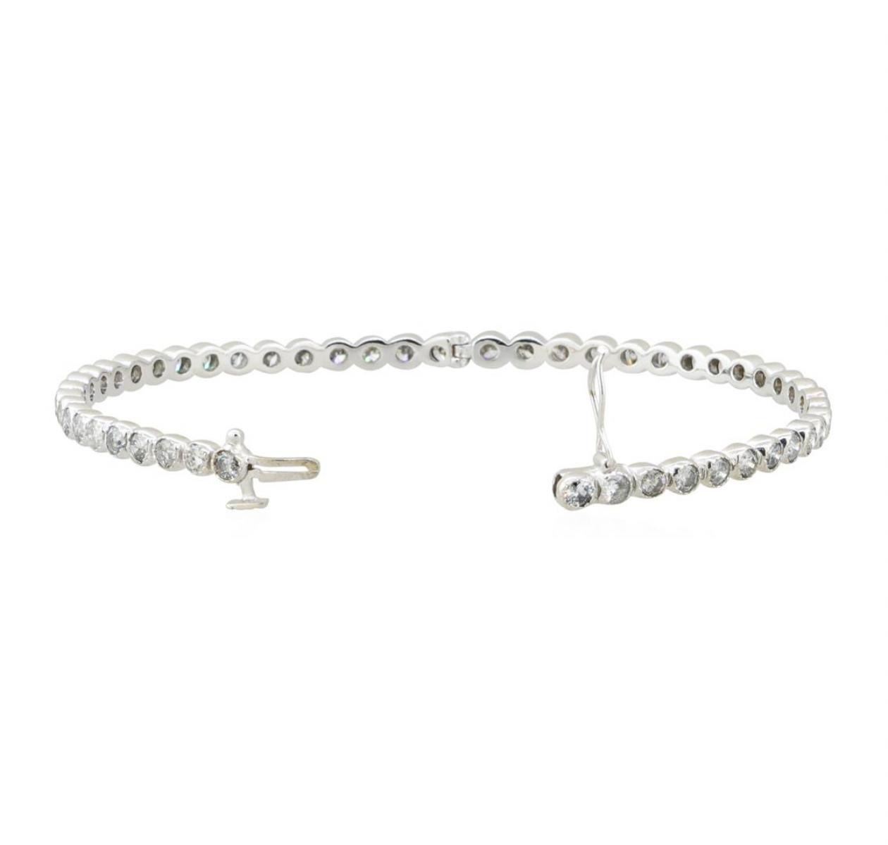 One electronically tested 18KT white gold ladies cast & assembled diamond bangle bracelet. The six and three quarters inch wearable length bangle bracelet features a rigid diamond ribbon supported by a hinged shoulder, completed by a concealed clasp with safety. Bright polish finish with milgrain detailing. Identified with markings of "750". Condition is new, good workmanship. Containing: Fifty bezel set round brilliant cut diamonds, measuring 3.00 - 3.00 x 1.80mm (depth est.) approximate total weight of 50 Stones = 4.97ct. The clarity grade reflects the overall average for the group. Graded in the setting.Clarity I-2 Color G - H Total Weight of Diamonds 4.97 ct. Total Weight of Bangle Bracelet 11.50 gm Estimated Retail Value $ 12,155.00 US.