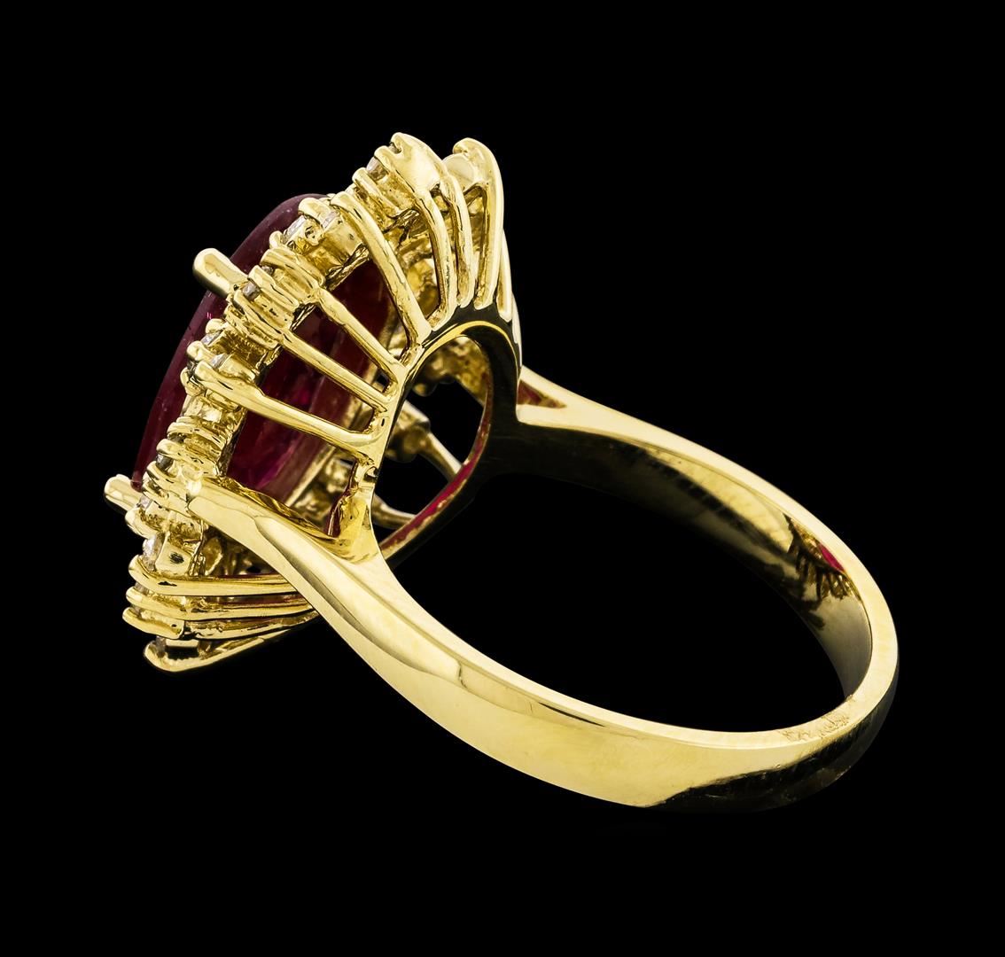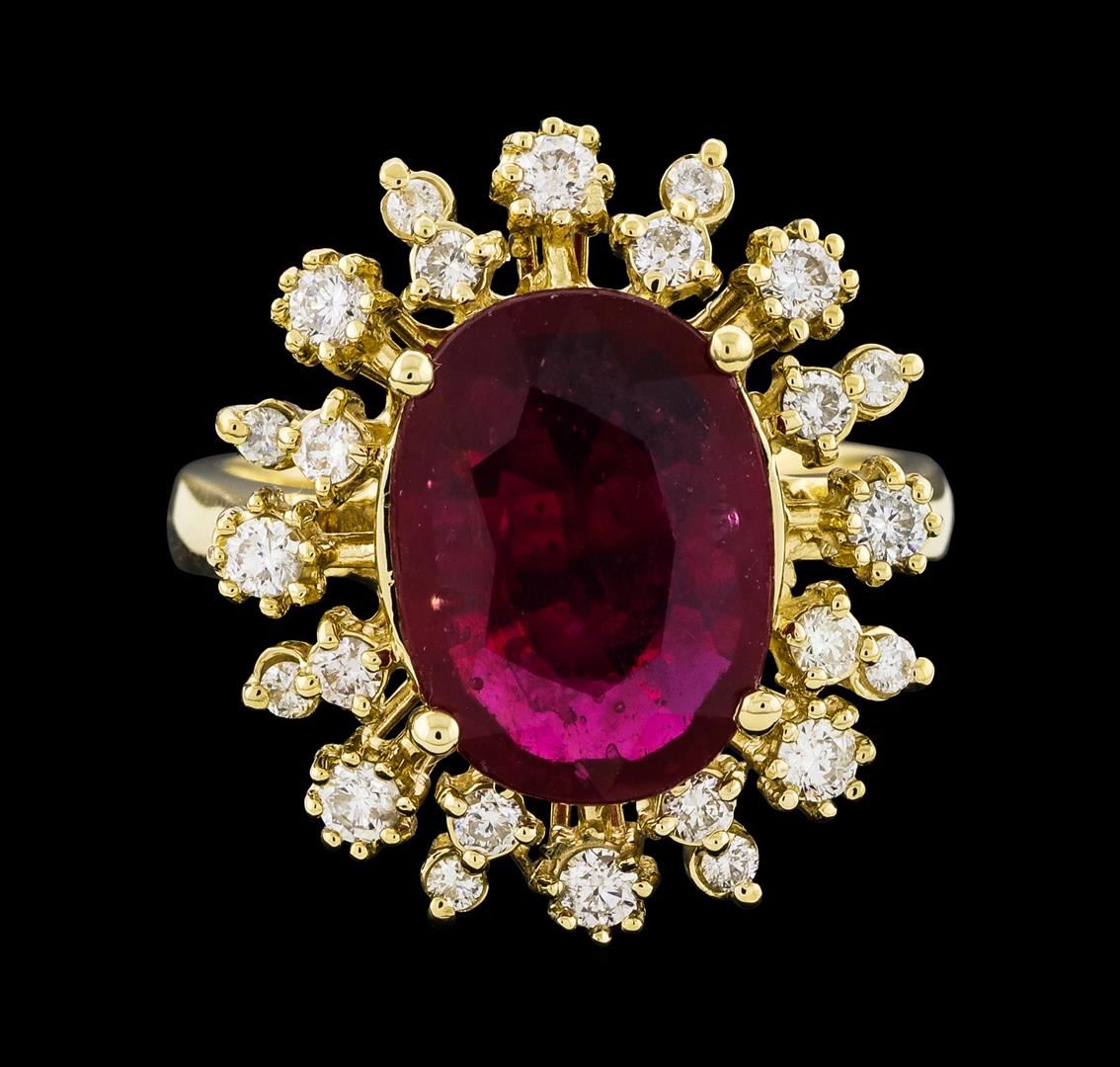 One Ruby and Diamond Ring featuring: 14KT Yellow Gold with a total weight of 5.71 grams, Ruby with a total weight of 4.97ct, and 24 Diamonds with a total weight of 0.56ctw.