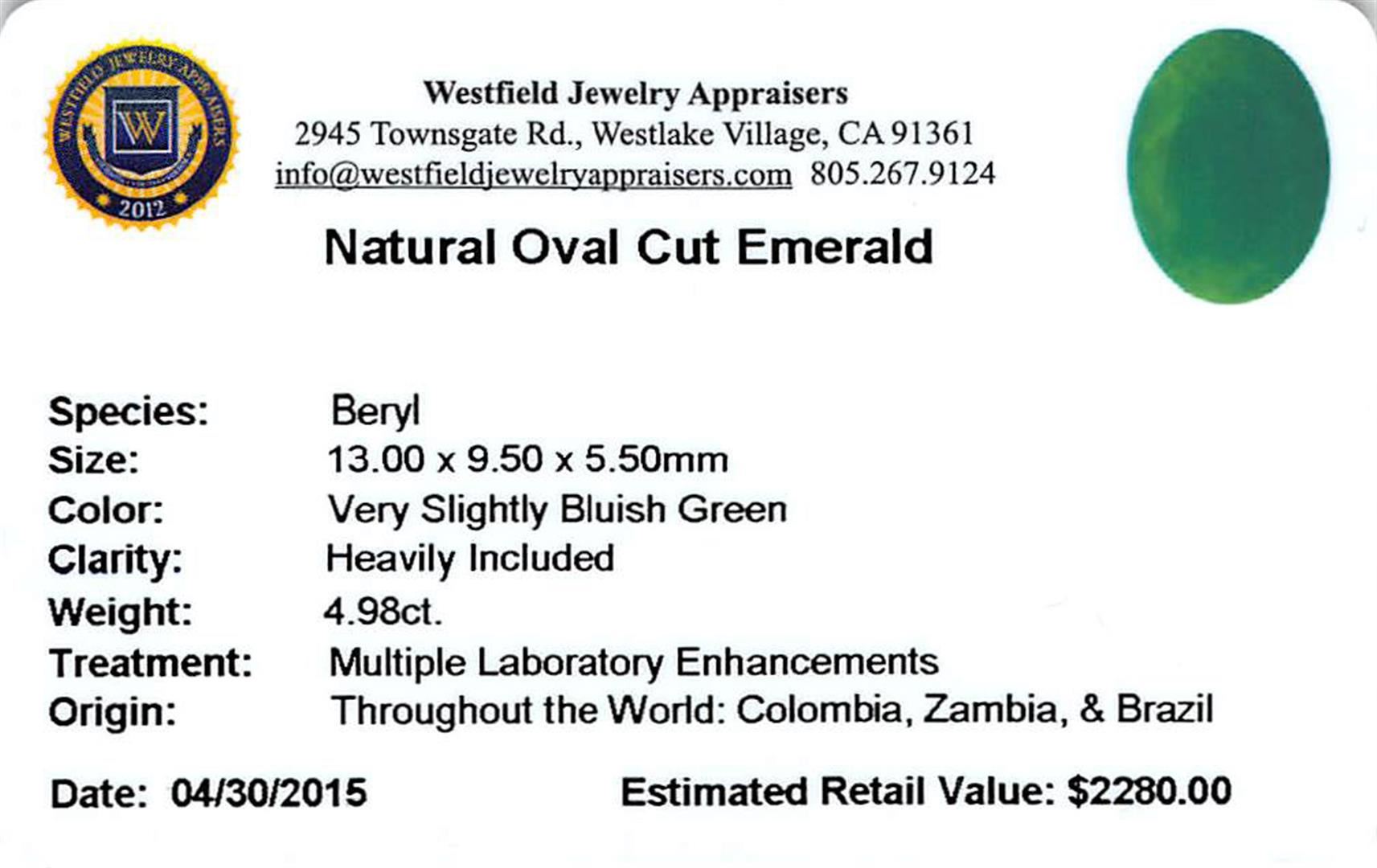 One oval mixed cut natural emerald exact weight 4.98ct., clarity is heavily included, type III, medium dark, very slightly grayish, very slightly bluish green color, (GIA vslbG 6/3), cut is good. Westfield Appraised at $2,280.00.