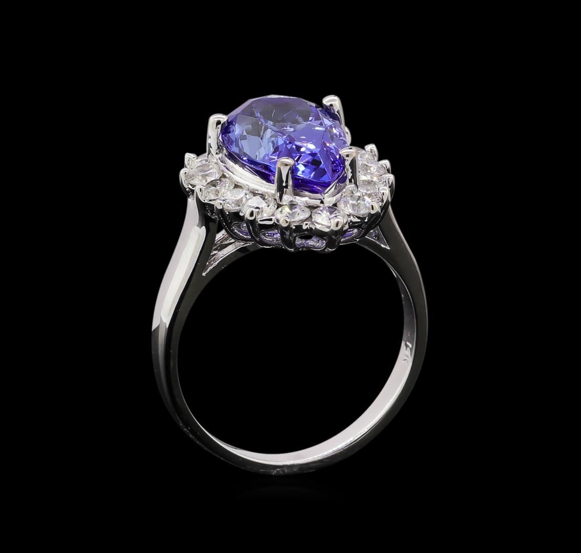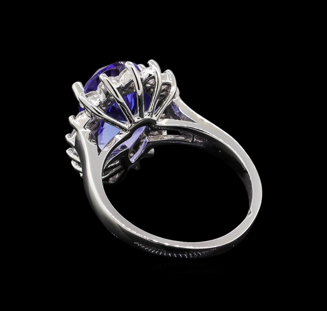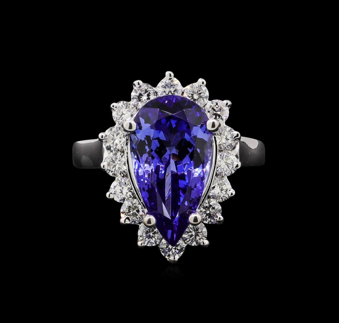 One electronically tested 14KT white gold lady's cast fashion ring with a basket halo with a bright polish finish. The featured lady's ring has a shank measuring 1.99 millimeters in width. Identified with markings of '14K'. Condition is new, good workmanship. Containing: One prong set pear modified brilliant cut natural tanzanite, measuring 15.12 x 8.30 x 6.15mm, (depth est.) approximate weight of 4.98ct., clarity is eye clean, medium, moderately strong, bluish violet color, (GIA bV 5/4), cut is very good. Transmitting light with no distortion, transparent. Colored gemstones are presumed to have been subjected to commonly used enhancement processes. Graded in the setting. Sixteen prong set round brilliant cut diamonds, measuring 2.60 - 2.50 x 1.58mm (depth est.) approximate total weight of 16 Stones = 0.98ct. Graded in the setting. Clarity SI-1 to I-1. Color: H - I Cut Good. Total Weight of Colored Stones 4.98ct.. Total Weight of Diamonds 0.98ct.. Total Weight of Ring 6.20gm. GAS Appraised at $10,630.00.