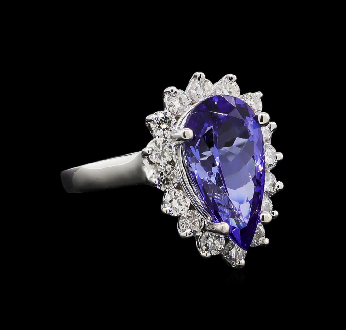 One electronically tested 14KT white gold lady's cast fashion ring with a basket halo with a bright polish finish. The featured lady's ring has a shank measuring 1.99 millimeters in width. Identified with markings of '14K'. Condition is new, good workmanship. Containing: One prong set pear modified brilliant cut natural tanzanite, measuring 15.12 x 8.30 x 6.15mm, (depth est.) approximate weight of 4.98ct., clarity is eye clean, medium, moderately strong, bluish violet color, (GIA bV 5/4), cut is very good. Transmitting light with no distortion, transparent. Colored gemstones are presumed to have been subjected to commonly used enhancement processes. Graded in the setting. Sixteen prong set round brilliant cut diamonds, measuring 2.60 - 2.50 x 1.58mm (depth est.) approximate total weight of 16 Stones = 0.98ct. Graded in the setting. Clarity SI-1 to I-1. Color: H - I Cut Good. Total Weight of Colored Stones 4.98ct.. Total Weight of Diamonds 0.98ct.. Total Weight of Ring 6.20gm. GAS Appraised at $10,630.00.