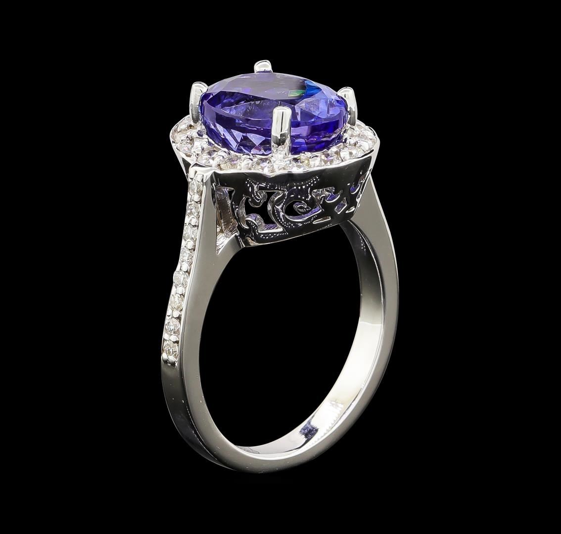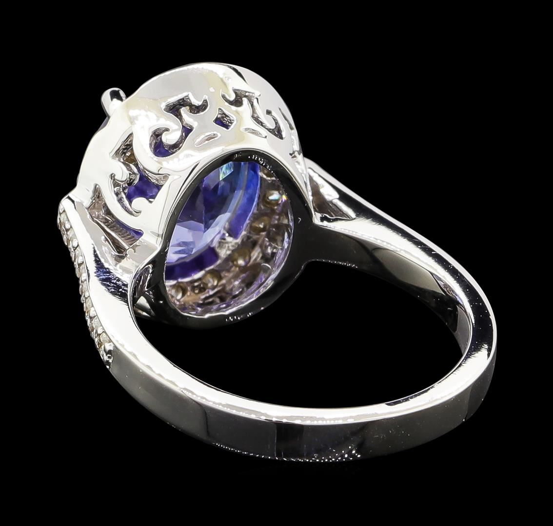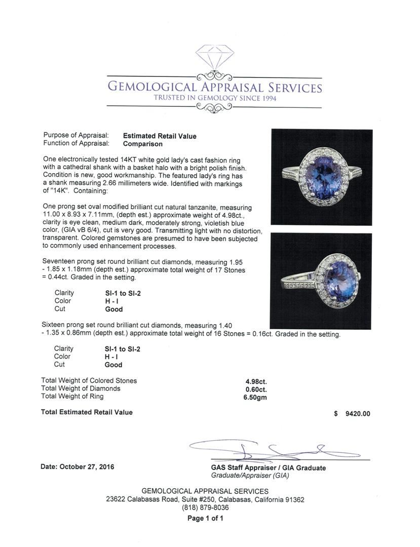 One electronically tested 14KT white gold lady's cast fashion ring with a cathedral shank with a basket halo with a bright polish finish. The featured lady's ring has a shank measuring 2.66 millimeters wide. Identified with markings of '14K'. Condition is new, good workmanship. Containing: One prong set oval modified brilliant cut natural tanzanite, measuring 11.00 x 8.93 x 7.11mm, (depth est.) approximate weight of 4.98ct., clarity is eye clean, medium dark, moderately strong, violetish blue color, (GIA vB 6/4), cut is very good. Transmitting light with no distortion, transparent. Colored gemstones are presumed to have been subjected to commonly used enhancement processes. Seventeen prong set round brilliant cut diamonds, measuring 1.95 - 1.85 x 1.18mm (depth est.) approximate total weight of 17 Stones = 0.44ct. Graded in the setting. Clarity SI-1 to SI-2. Color: H - I Cut Good Sixteen prong set round brilliant cut diamonds, measuring 1.40 - 1.35 x 0.86mm (depth est.) approximate total weight of 16 Stones = 0.16ct. Graded in the setting. Clarity SI-1 to SI-2. Color: H - I Cut Good. Total Weight of Colored Stones 4.98ct.. Total Weight of Diamonds 0.60ct.. Total Weight of Ring 6.50gm. GAS Appraised at $9,420.00.