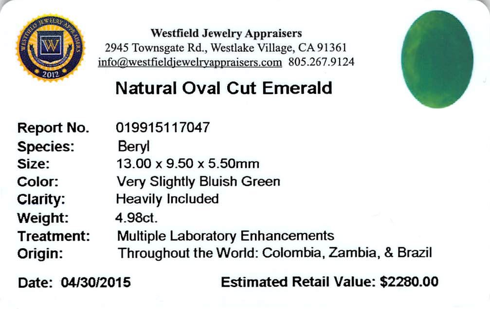 One oval mixed cut natural emerald exact weight 4.98ct., clarity is heavily included, type III, medium dark, very slightly grayish, very slightly bluish green color, (GIA vslbG 6/3), cut is good. Westfield Appraised at $2,280.00.