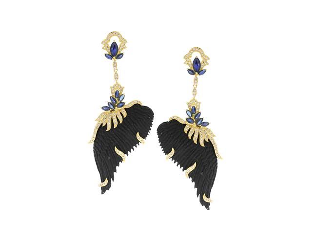 18k Gold Jet Black , BLUE SAPPHIRE AND DIAMOND WING EARRING/Diamond Count 1:154/Diamond 1 TCW:1.03/Diamond Color & Clarity:G-H/SI1-SI3/Diamond Count 2:/Diamond 2 TCW:/Diamond Count 3:/Diamond 3 TCW:/Diamond Color & Clarity:/Gemstone Count 1: 18/Gemstone 1 TCW:3.96/Gemstone Type:Sapphire/Gemstone Count 2: 2/Gemstone 2 TCW:/Gemstone Type:Jet Black /Gemstone Count 3: /Gemstone 3 TCW:/Gemstone Type:/Metal 1:18k GoldYellow Gold/Gram Weight:14.42/Weight/gram:/Gross Weight:16.87/Item-Size (HxW mm):