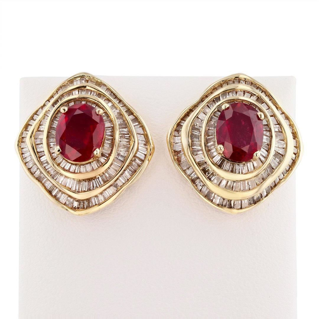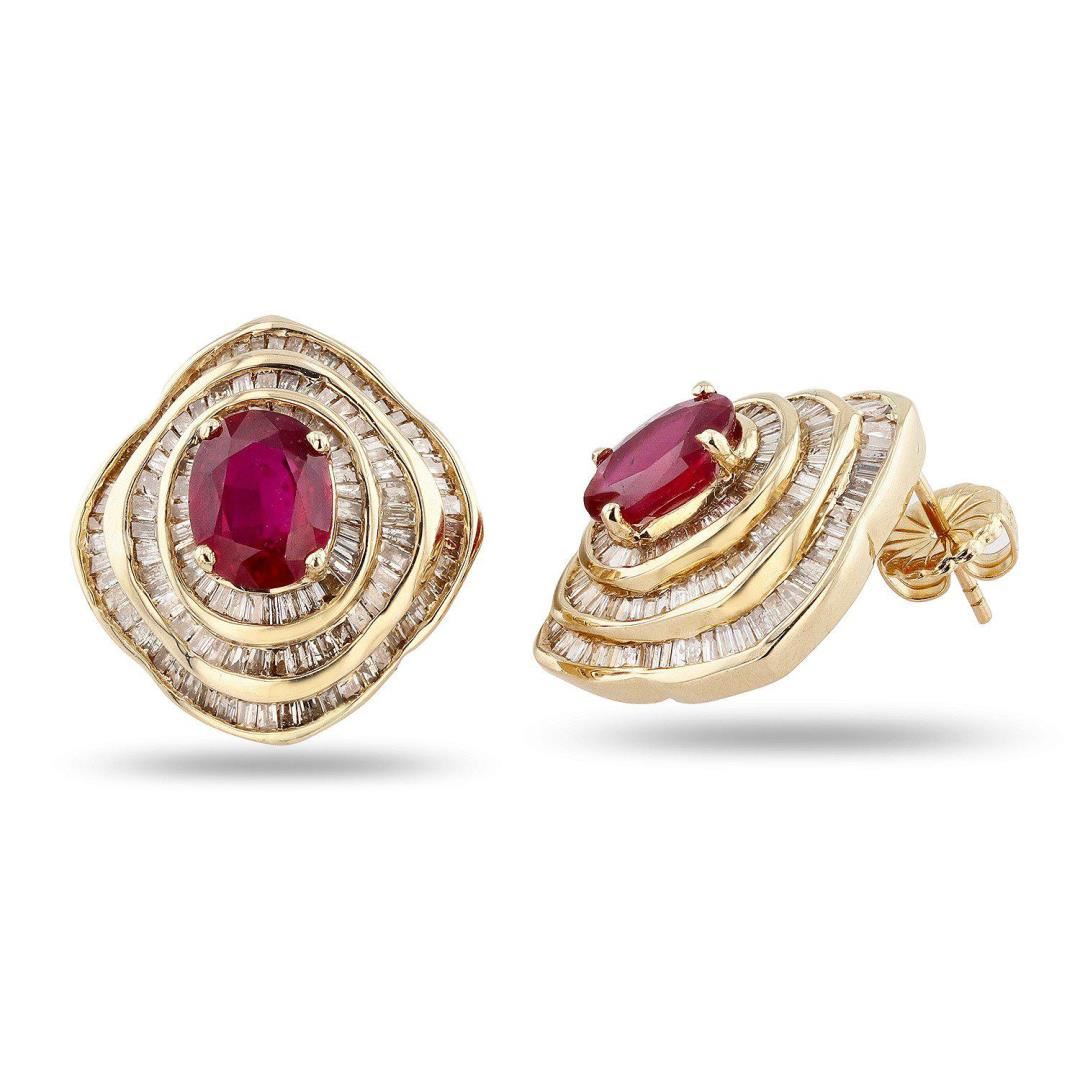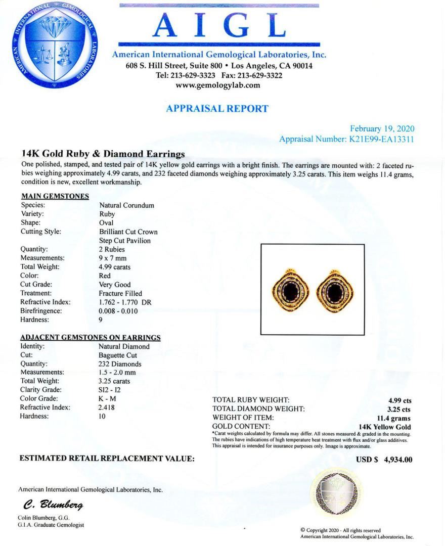 One polished, stamped, and tested pair of 14K yellow gold earrings with a bright finish. The earrings are mounted with: 2 faceted ru-bies weighing approximately 4.99 carats, and 232 faceted diamonds weighing approximately 3.25 carats. This item weighs 11.