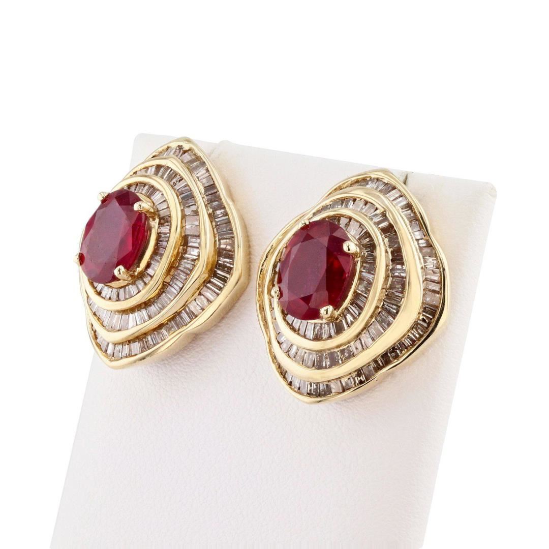 One polished, stamped, and tested pair of 14K yellow gold earrings with a bright finish. The earrings are mounted with: 2 faceted ru-bies weighing approximately 4.99 carats, and 232 faceted diamonds weighing approximately 3.25 carats. This item weighs 11.4 grams, condition is new, excellent workmanship. MAIN GEMSTONES Species: Natural Corundum Variety: Ruby Shape: Oval Cutting Style: Brilliant Cut Crown Step Cut Pavilion Quantity: 2 Rubies Measurements: 9mm x 7mm Total Weight: 4.99 carats Color: Red Cut Grade: Very Good Treatment: Fracture Filled Refractive Index: 1.762 - 1.770 DR Birefringence: 0.008 - 0.010 Hardness: 9 ADJACENT GEMSTONES ON EARRINGS Identity: Natural Diamond Cut: Baguette Cut Quantity: 232 Diamonds Measurements: 1.5mm to 2.0mm Total Weight: 3.25 carats Clarity Grade: SI2 to I2 Color Grade: K - M Refractive Index: 2.418 Hardness: 10 TOTAL RUBY WEIGHT: 4.99 cts TOTAL DIAMOND WEIGHT: 3.25 cts WEIGHT OF ITEM: 11.4 grams GOLD CONTENT: 14K Yellow Gold