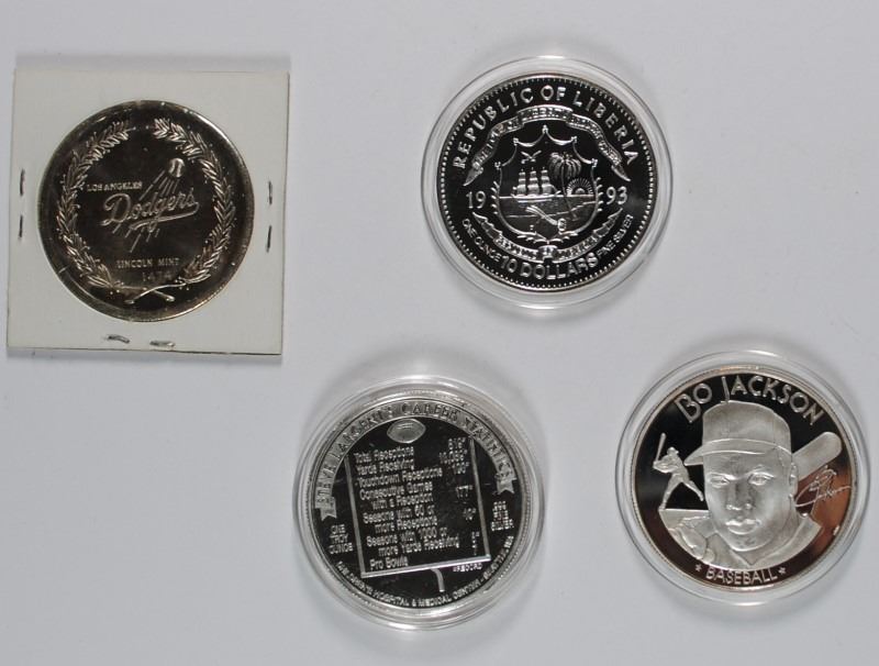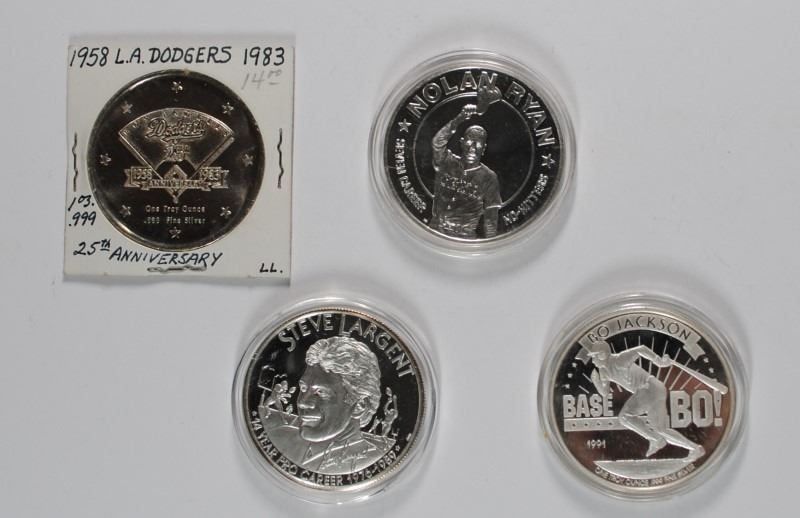 4 - .999 SILVER ROUNDS - DODGERS, RYAN, BO JACKSON & STEVE LARGENT, TOTAL 4 ozt
