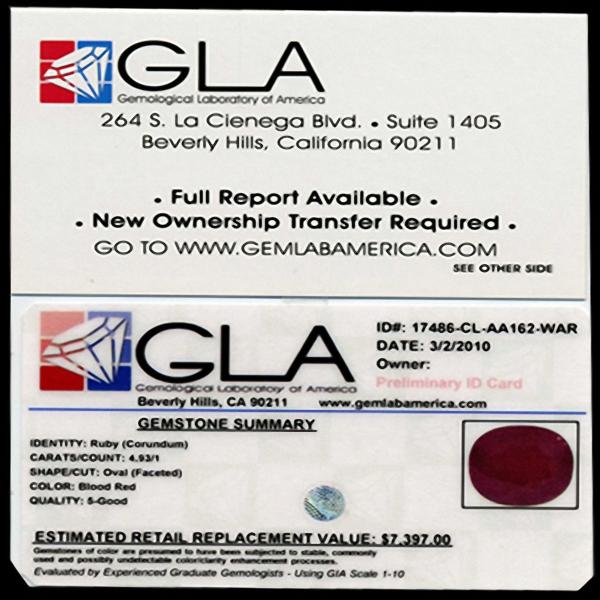Very good oval cut specimen with stabilization treatment; average inclusions with significant translucense upon backlighting and good glow upon frontlighting; lab quality evaluation 5; typical stabilization treatment likely; Gem Guide wholesale $2095-$3254; full retail appraisal $7397; full lab evaluation available