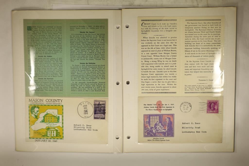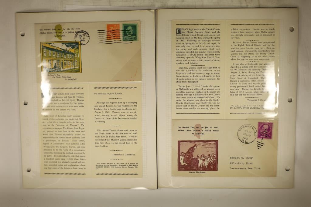 WITH CANCELLED STAMPS AND INFORMATIONAL LEAFLET. 1940 ABRAHAM LINCOLN BEFORE THE ILLINOIS SUPREME COURT, 1940 ABRAHAM LINCOLN THE DEBATER, 1940 HOFFMAN'S ROW ON NORTH FIFTH STREET IN SPRINGFIELD AND 1941 MASON