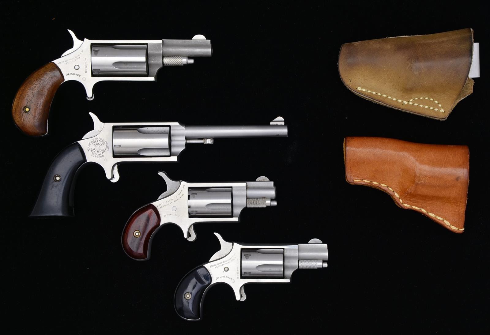 1) CASULL IMPROVEMENT FREEDOM ARMS SINGLE ACTION REVOLVER. Cal. 22 Mag. S# B25438. Bbl. 3". 4 Shot fluted cyl. stainless steel w/ 2 piece black plastic pistol grip. Front blade sight & rear notch. CONDITION: grip appears free of any noticeable blemishing, aside from light scratches. Bore is bright. Gun is in time. (20-3738/JZ). MODERN. 2) NORTH AMERICAN ARMS SINGLE ACTION REVOLVER. Cal. 22 LR. S# G47284. Bbl. 1". Stainless steel w/ wood grip panels. Five shot fluted cyl. Fixed blade front sight. No rear sight. CONDITION: grips appear free of any noticeable blemishing, other than a few gentle scratches. Bore is shiny. Gun is in time. (20-3821/JZ). 3) NORTH AMERICAN ARMS SINGLE ACTION REVOLVER. Cal. 22 LR. S# B09477. Bbl. 1". Stainless steel w/ plastic grip panels. Five shot fluted cyl. Fixed blade front sight. No rear sight. UNATTACHED ACCESSORIES: fitted leather holster w/ spring loop. CONDITION: right grip appears free of any noticeable blemishing, left grip exhibits a crack at attachment point. Bore is shiny. (20-3827/JZ). 4) NORTH AMERICAN ARMS SINGLE ACTION REVOLVER. Cal. 22 Mag. S# D6915. Bbl. 1 1/2". Stainless steel blend of matte & polished finish. Wooden grips. Front blade w/ rear notch. 5 Shot fluted cyl. UNATTACHED ACCESSORIES: leather holster w/ spring loop clip. CONDITION: while overall appearance doesn’t signify an abundance of use, the cyl. appears to be just out of time. Wood grips illustrate a few sm. impressions. Bore is shiny. (20-3831/JZ). ALL MODERN. $800-1,200.