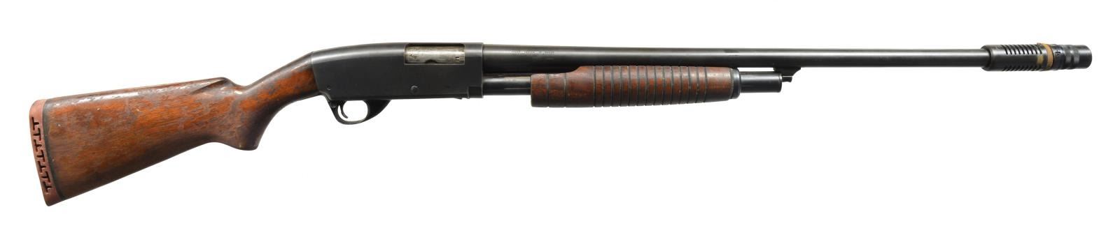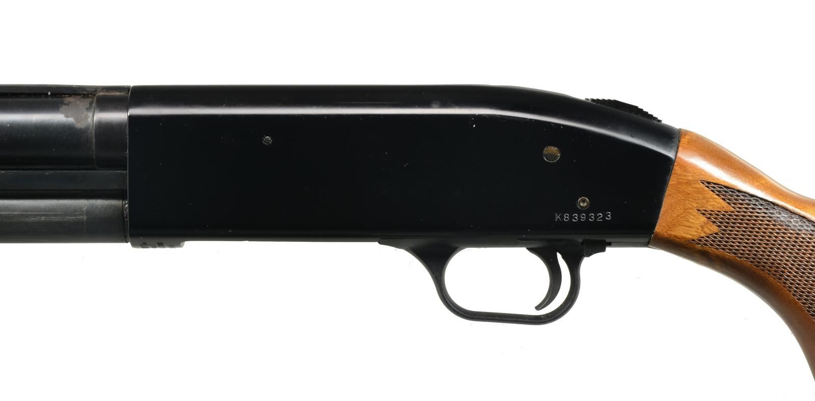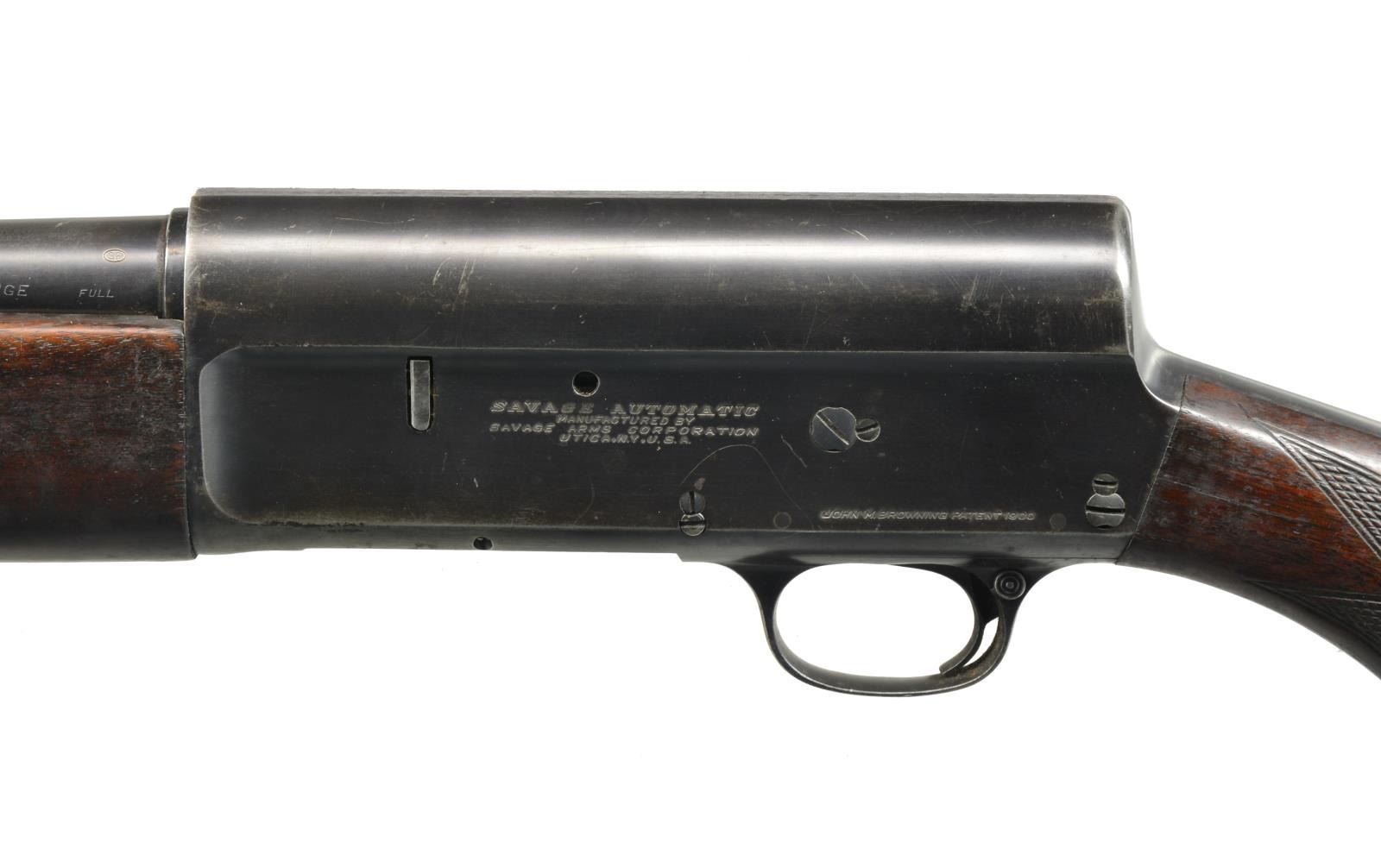 1) SAVAGE AUTOMATIC. Cal. 16 Ga. S# 18513. Bbl. 28" plain w/ fixed Full choke & ramp mounted steel bead. Recoil operated action w/ squared back receiver marked "JOHN M BROWNING PATENT 1900". Finger grooved checkered walnut forearm & pistol grip stock. LOP: 13 7/8" over aftermarket Pachmayr pad. CONDITION: 80% dull lightly faded blue showing sm. spots of corrosion. Wood has age darkened worn appearance showing handling marks & numerous mildew spots. Stock has a sm. crack extending from left side of receiver w/ lg. crack extending from recoil pad. Bore is generally bright w/ spots of pitting in choke area. (20-2758/DS). CURIO. 2) STEVENS MODEL 77A PUMP. Cal. 12 Ga., 2 3/4". NSN. Bbl. 28" plain over Savage Super-Choke adj. compensator. Aluminum front bead. Grooved walnut extension forearm. Pistol grip walnut stock. LOP: 14 1/8" over aftermarket recoil pad. CONDITION: 75% lightly faded blue showing spots of surface corrosion. Wood has dark worn appearance w/ peeling finish, scratches & handling marks having a sm. chip right of trigger guard tang. Good bright bore. (20-2762/DS). CURIO. 3) MOSSBERG MODEL 500A PUMP. Cal. 12 Ga., 2 3/4" & 3". S# K839323. Bbl. 28" VR w/ interchangeable choke; IC tube included. White front bead w/ brass mid bead. Alloy action w/ sliding top safety. Hardwood forearm & pistol grip stock w/ pressed checkering & original recoil pad. CONDITION: 90% metal finish showing scattered spots of rust on bbl. Wood show a few mildew spots. Good bright bore. (20-2771/DS). MODERN. 4) HIGH STANDARD FLIGHT KING DELUXE K2011 PUMP. Cal. 20 Ga., 2 3/4" & 3". S# 3061266. Bbl. 28" plain w/ fixed Mod. choke. Blued steel action w/ alloy trigger guard & jeweled bolt. Finger groove walnut forearm & plastic capped pistol grip stock w/ pressed checkering. LOP: 14" over recoil pad & white line spacer. CONDITION: 90% blue showing sm. spots of surface corrosion. Wood has good finish showing sm. scratches & marks. Bore is bright showing a slight ring in choke area. (20-2776/DS). MODERN. $500-750.