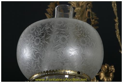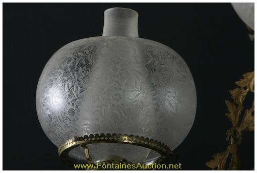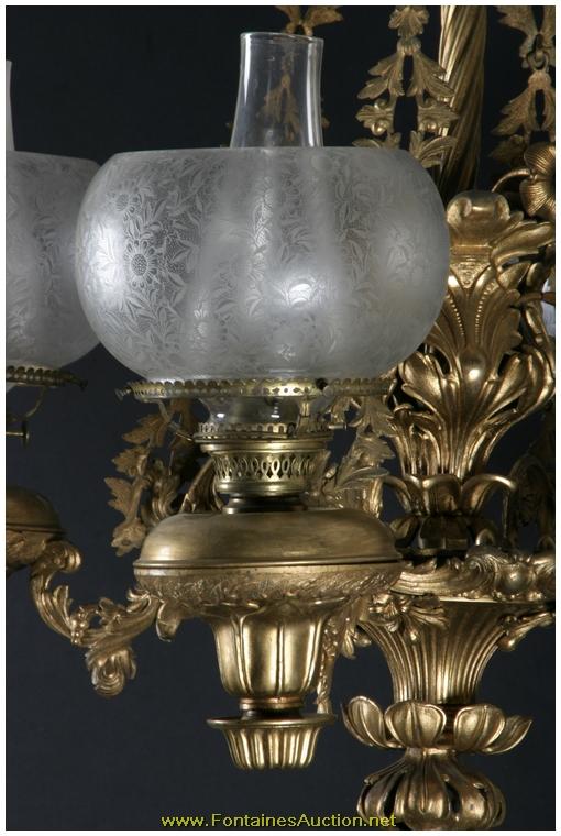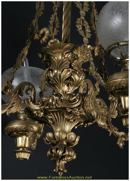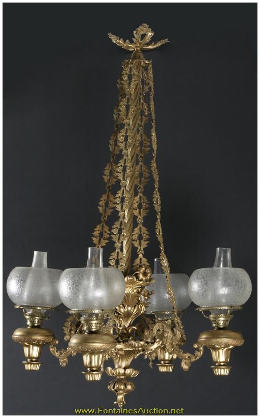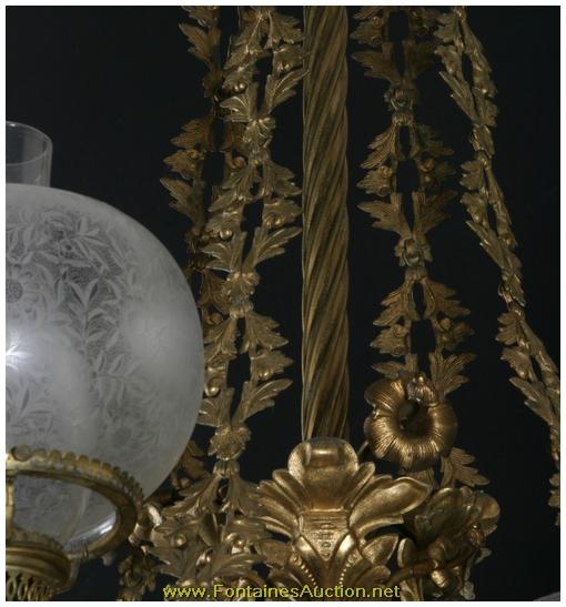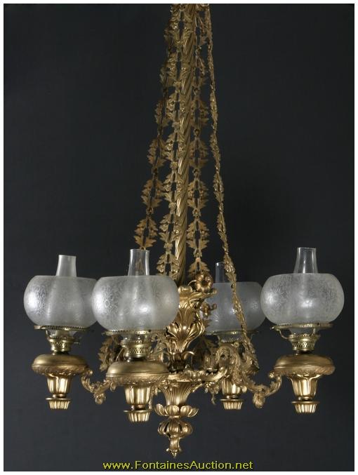 4 Arm Gilt Brass Chandelier. Leaf molded with 4 short arms, original oil fonts, etched globes and chimneys, twisted center shaft and 4 long chains from the top to the fonts. 34"W x 40"H x 35"D. Estimated Value$5,000 - 7,500.