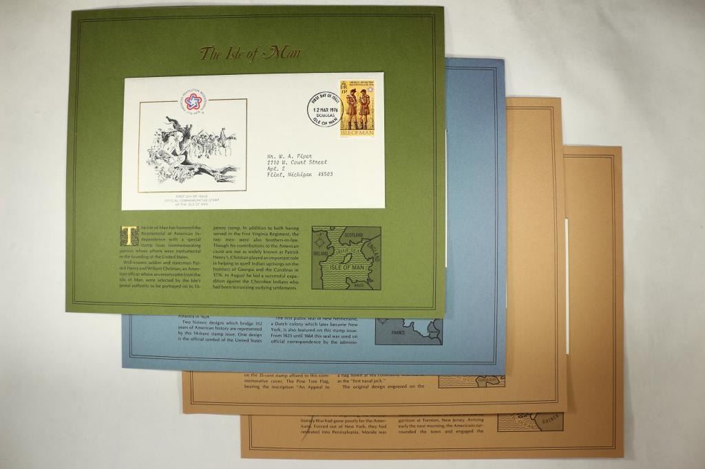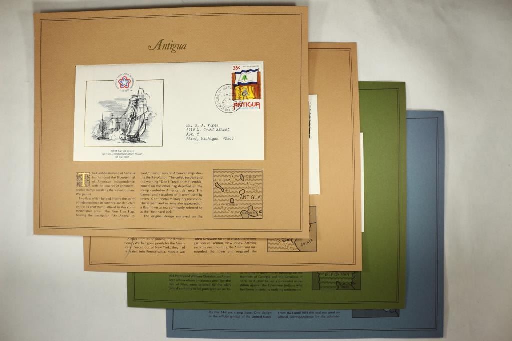STAMPS ON INFO SHEETS, ANTIGUA, GUINEA-BISSAU, THE ISLE OF MAN AND KINGDOM OF BELGIUM