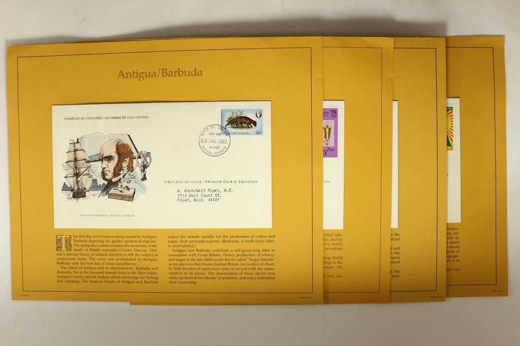 WITH STAMPS ON INFO CARDS. ANTIGUA / BARBUDA, BRUNEI, KIRIBATI AND PAKISTAN