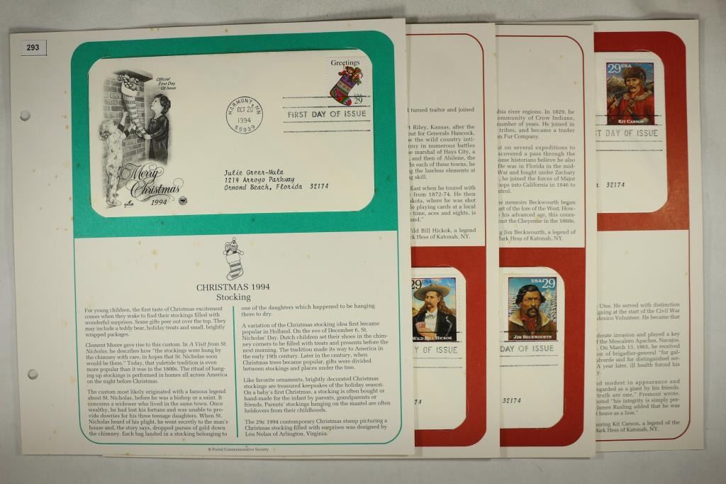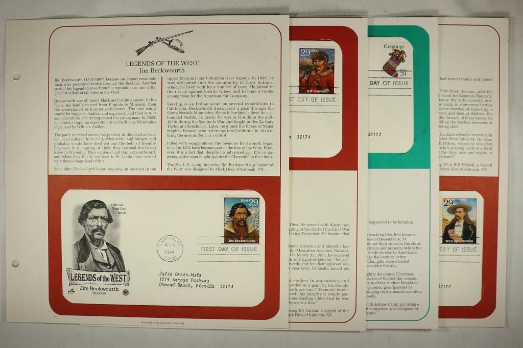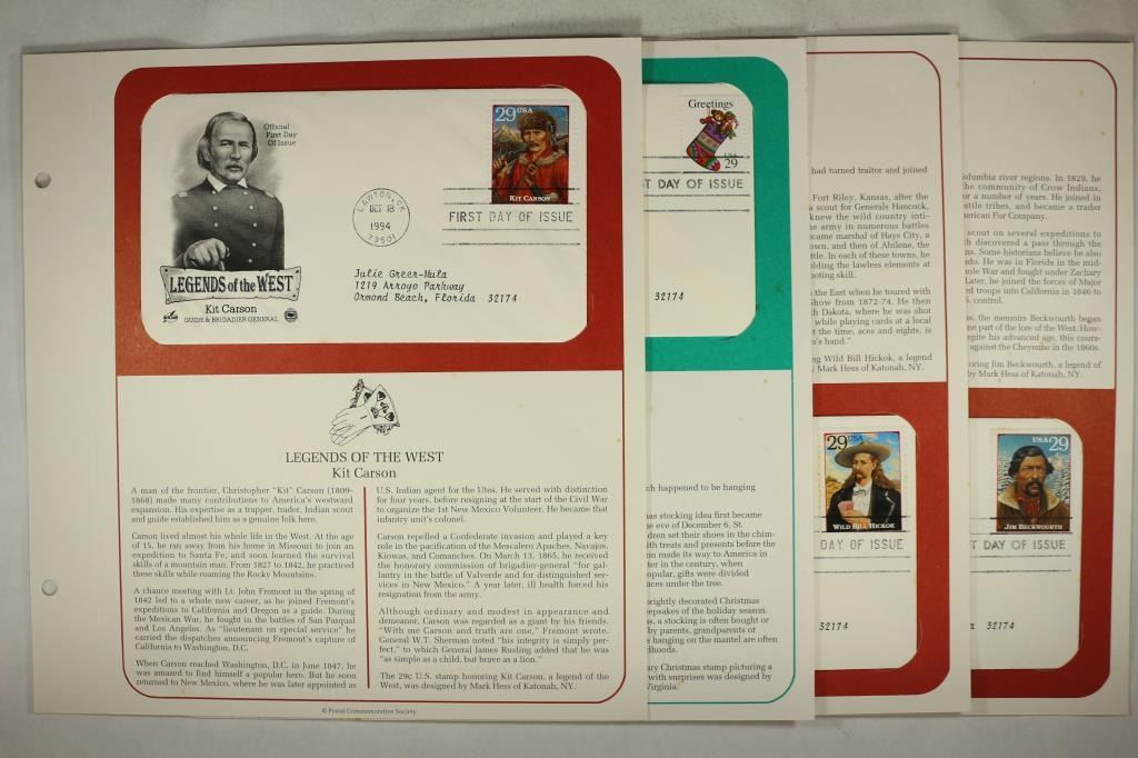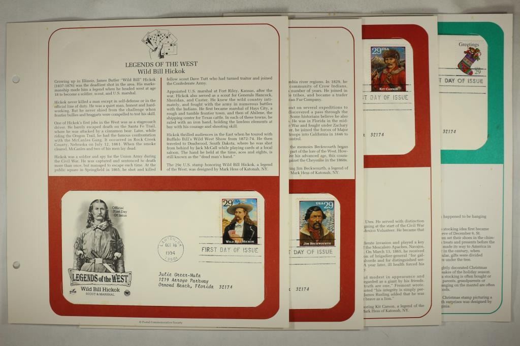 STAMPS ON INFO CARDS, 3 ARE LEGENDS OF THE WEST AND THE OTHER IS CHRISTMAS STOCKING