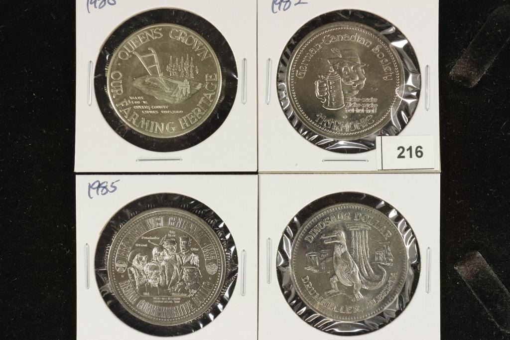 1980 QUEEN'S COUNTY NOVA SCOTIA, 1982 GERMAN CANADIAN SOCIETY, 1985 NORTHWEST CENTENNIAL REGINA AND DINOSAUR DOLLAR DRUMHELLER ALBERTA