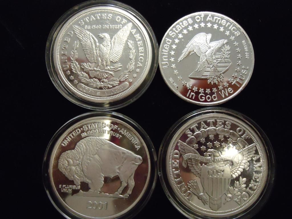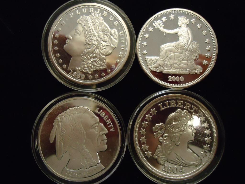 4 ASSORTED US REPLICA COINS 1-100 MIL.999 SILVER