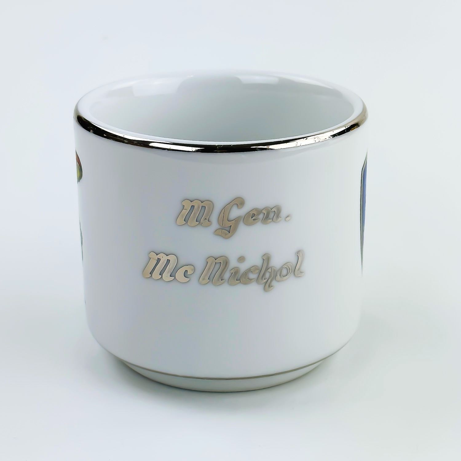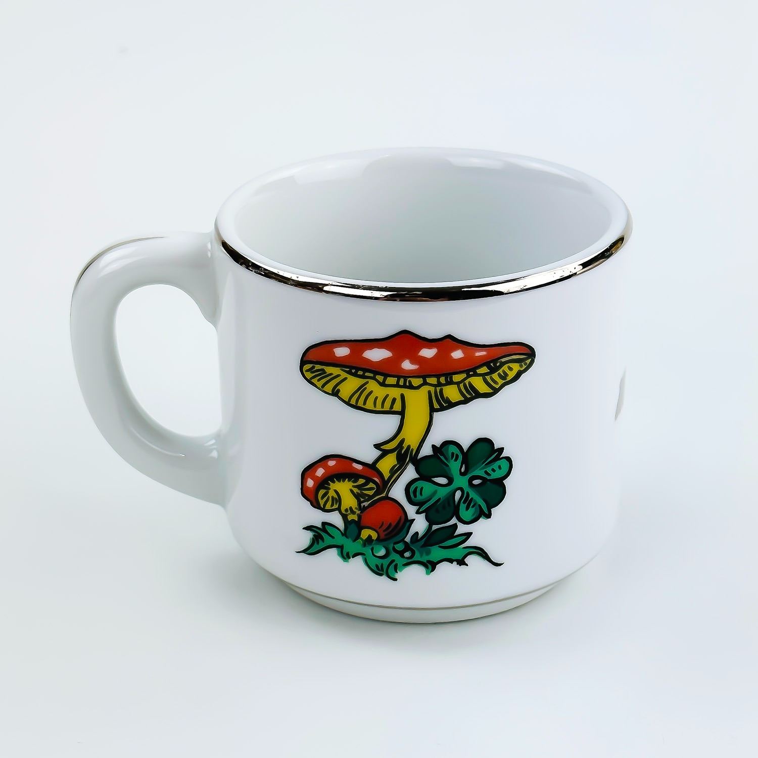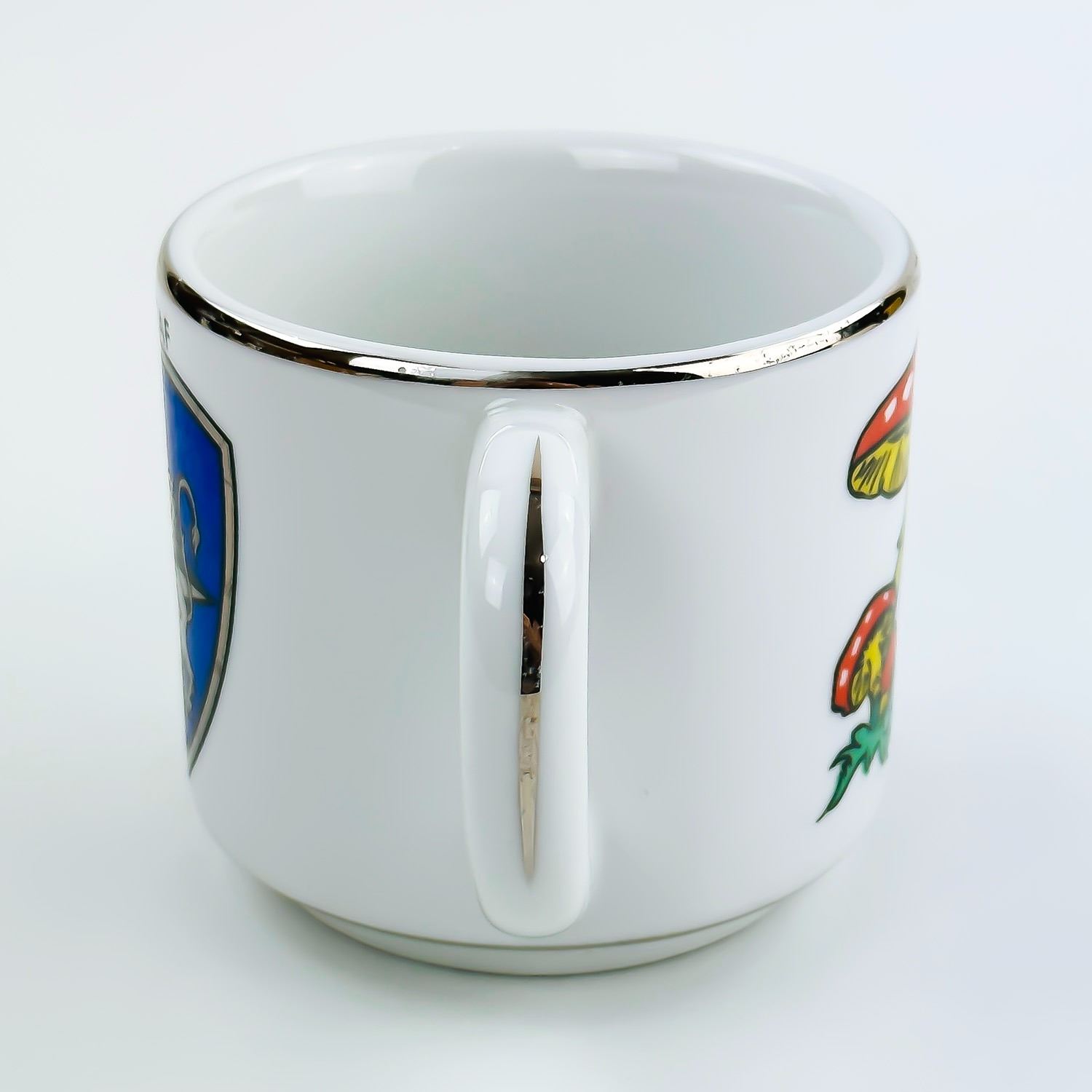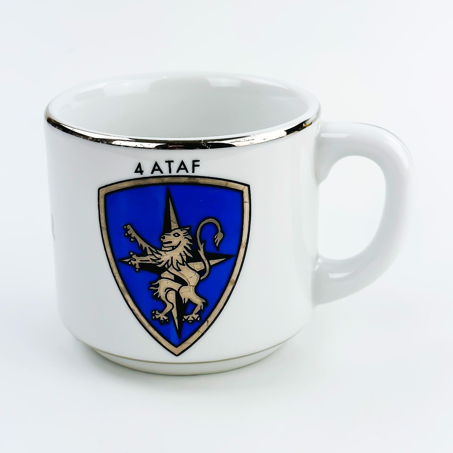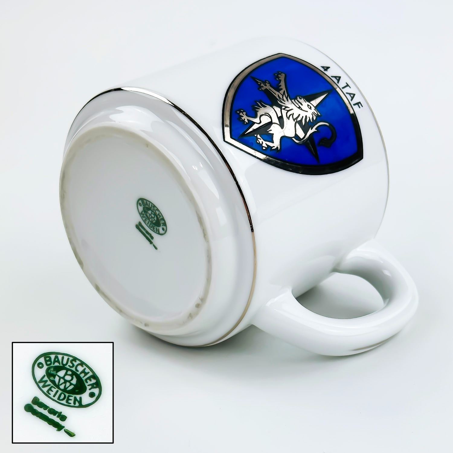 #8342 - VINTAGE 70’S OR 80’S MILITARY EMBLEM MUG - MUSHROOMS DESIGN COFFEE MUG . 4 ATAF - FOURTH ALLIED TACTICAL AIR FORCE. THICK RESTAURANT WARE STYLE MUG BY BAUSCHER WEIDEN - BAVARIA, GERMANY. MEASURES: 5” (12.75 CM) WIDE - INCLUDES HANDLE AND 3.5” (9 CM) DIAMETER