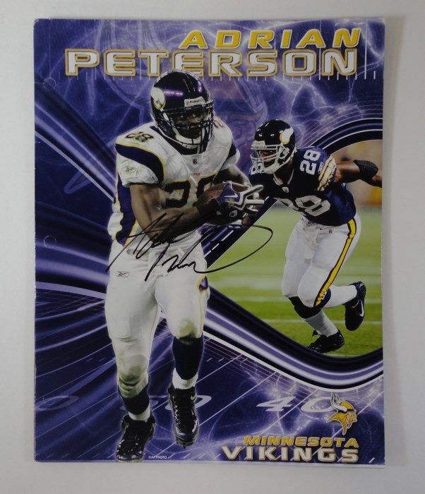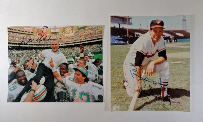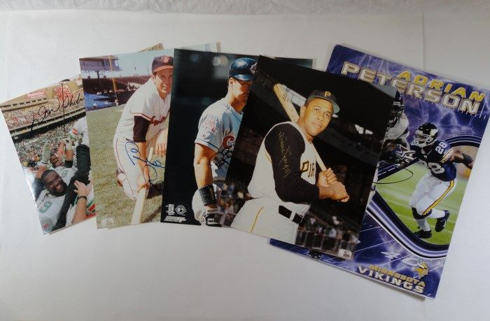 Don Shula Dolphins Signed 8x10 Photo, Adrian Peterson Minnesota Vikings Signed Folder, Brooks Robinson Signed 8x10 Photo, Willie Stargell Pirates Signed 8x10 Photo, and Pat Borders Cleveland Indians Signed 8x10 Photo. No COAs. Est. Value $100.00 - $125.00.