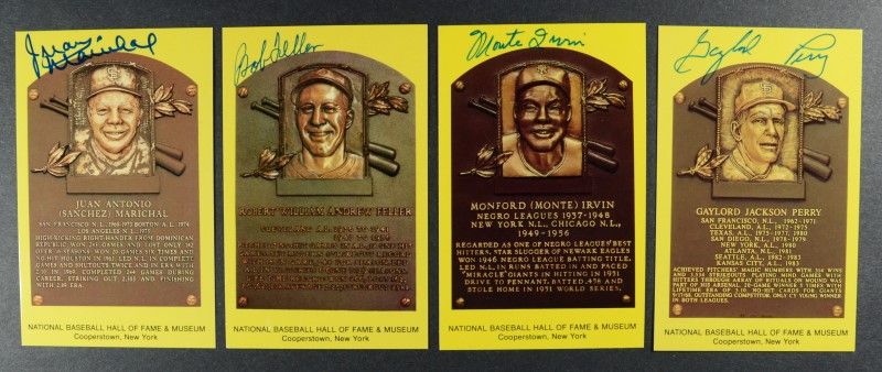 4 - AUTOGRAPHED HOF GOLD PLAQUE POST CARDS, FELLER, IRVIN, PERRY, MARICHAL