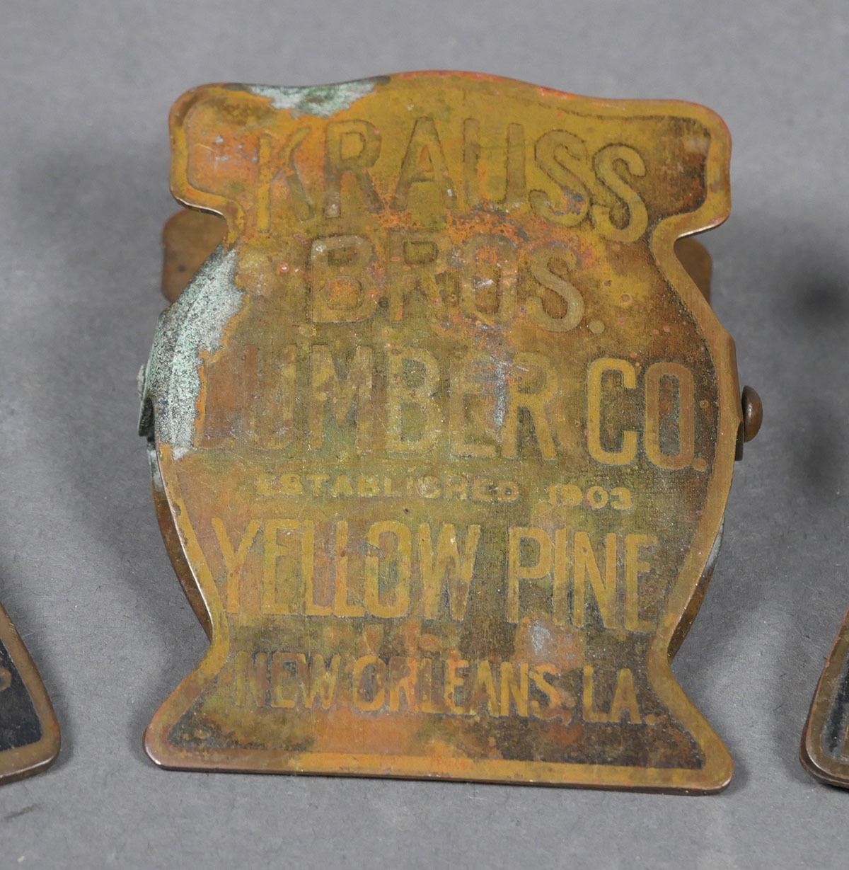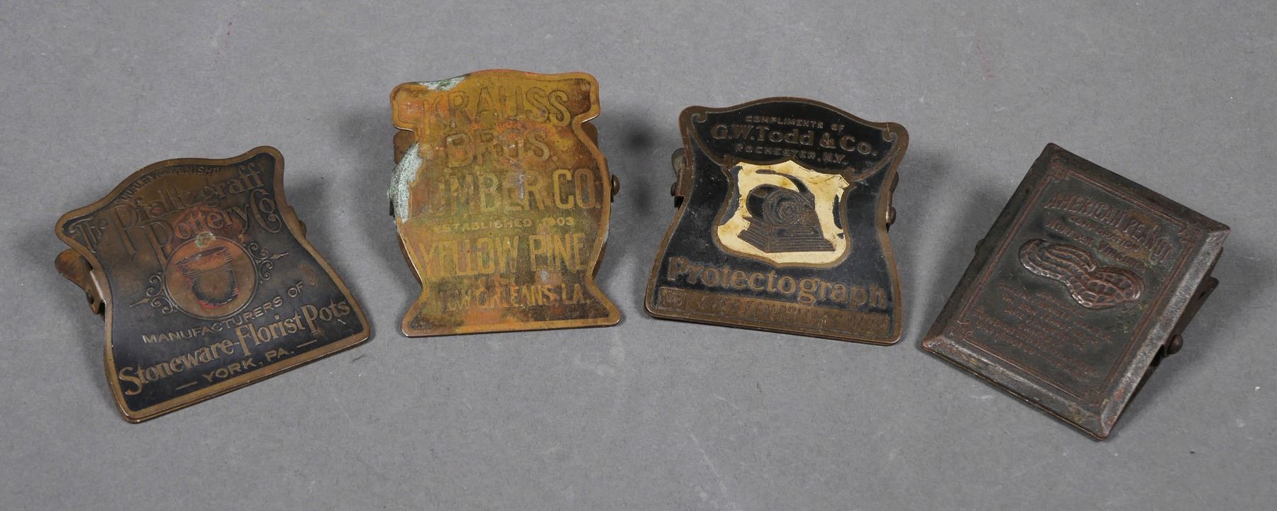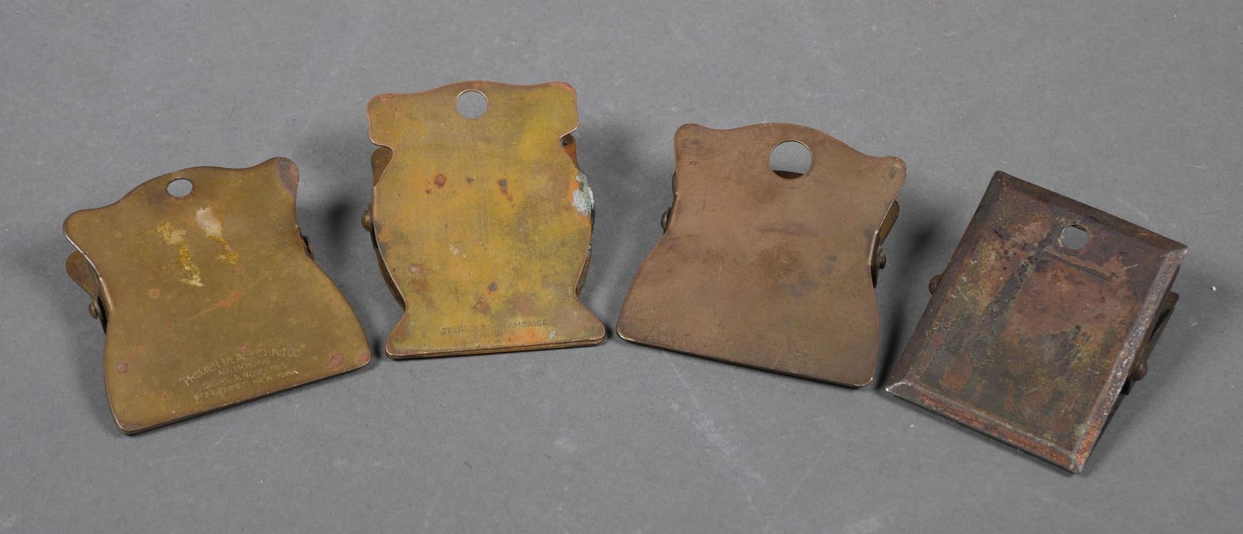 Four antique advertising metal & brass paper binder clips. 1) American Peanut Corp. Norfolk, VA. 2) Krauss Bros. Lumber Company New Orleans, LA. Made by Etching Co. of America. 3) G.W. Todd & Co. Rochester, NY. 4) Pfaltzgraff Pottery Co. York, PA. Made by Premier Metal Etching Co. NY. All clips have age appropriate wear & oxidation. Springs for all the clips work. largest clip measures 2 7/8" in length.