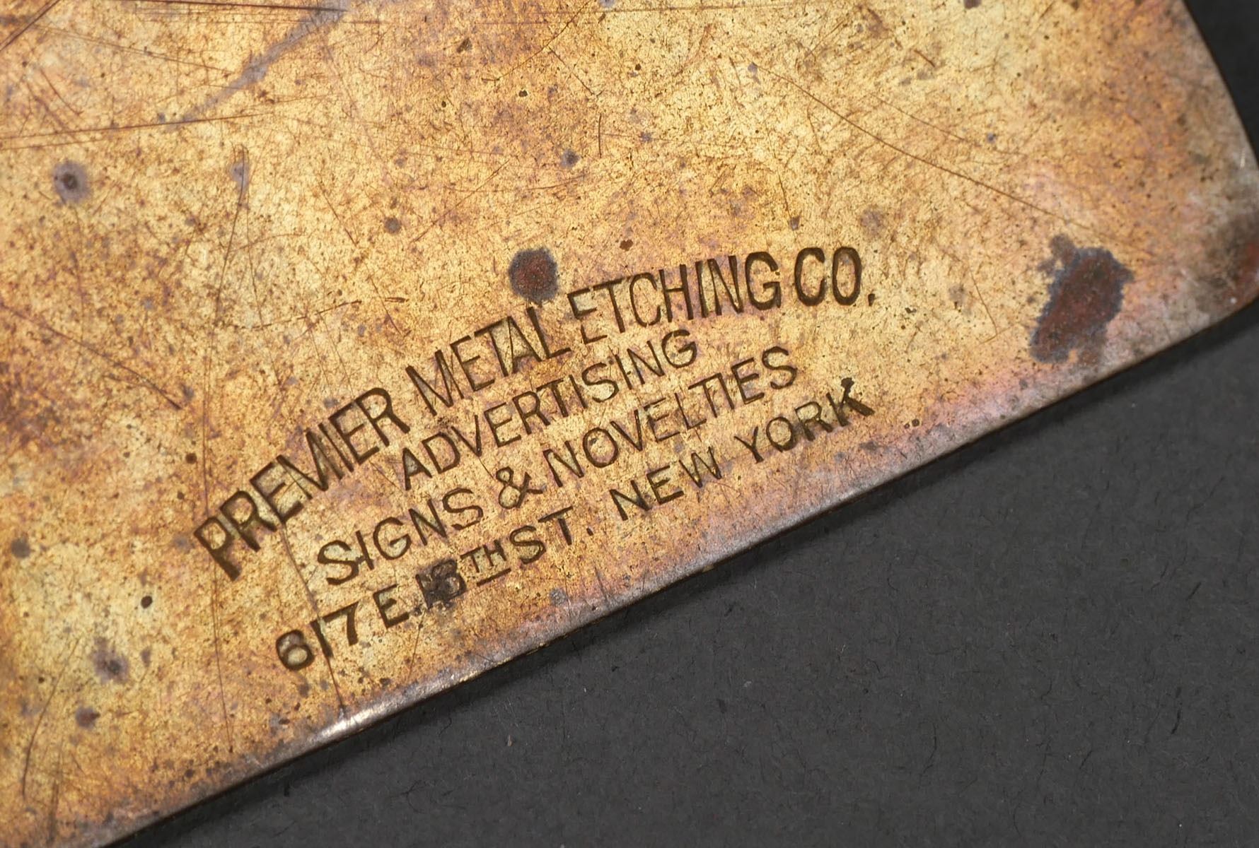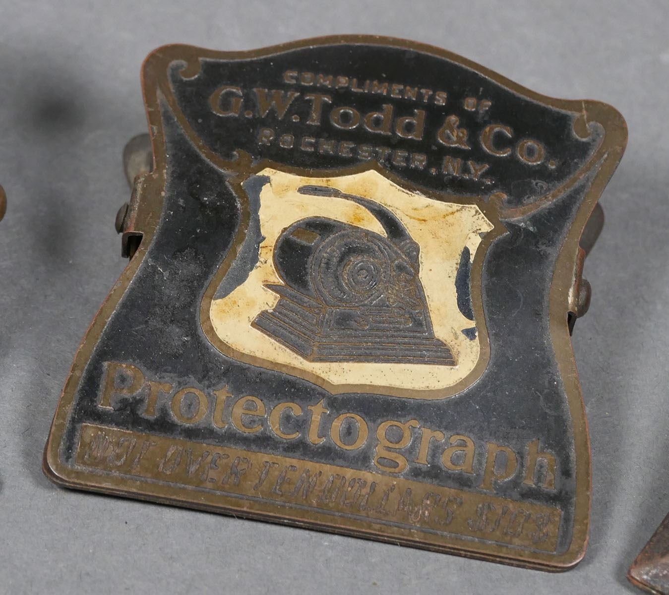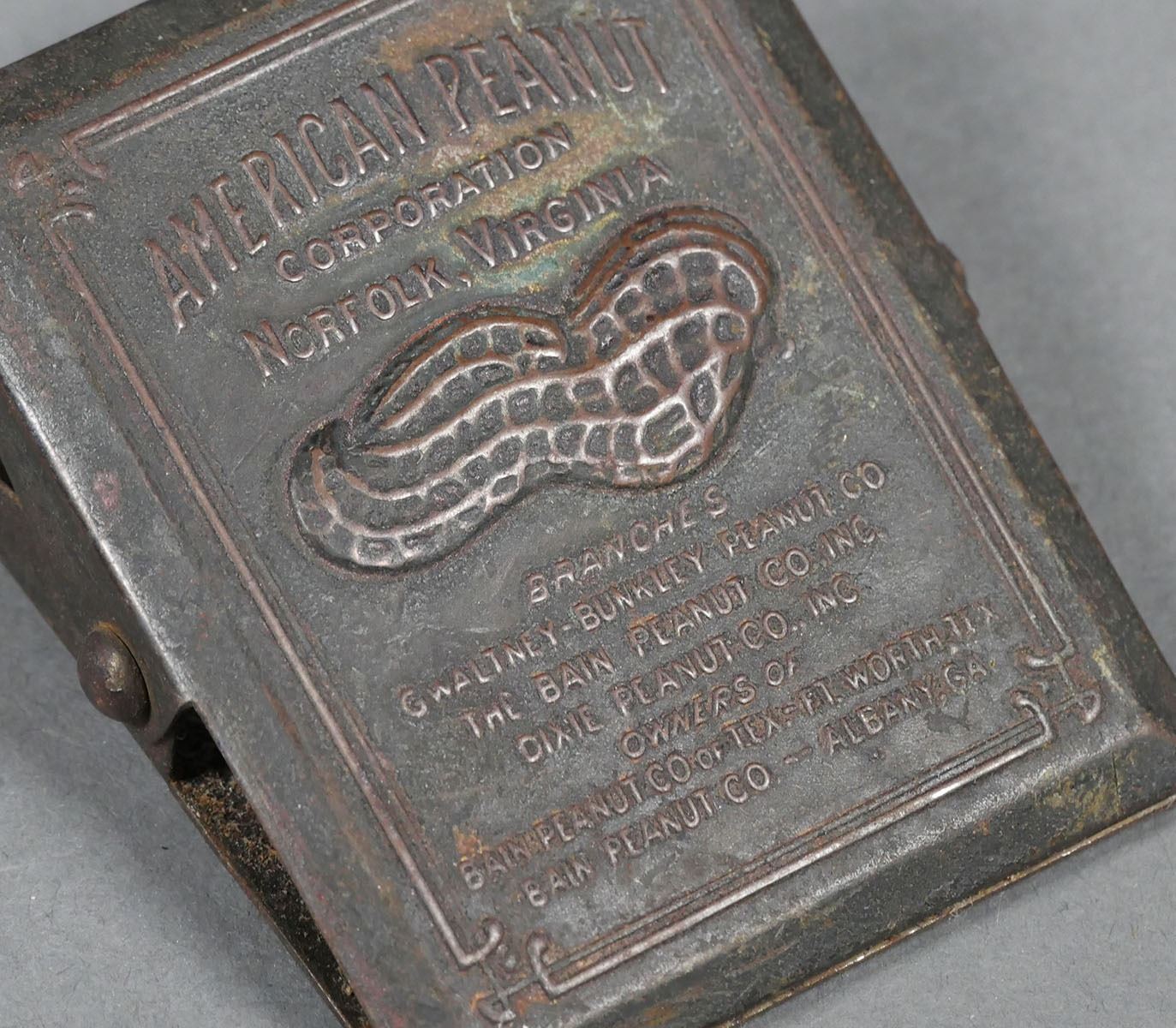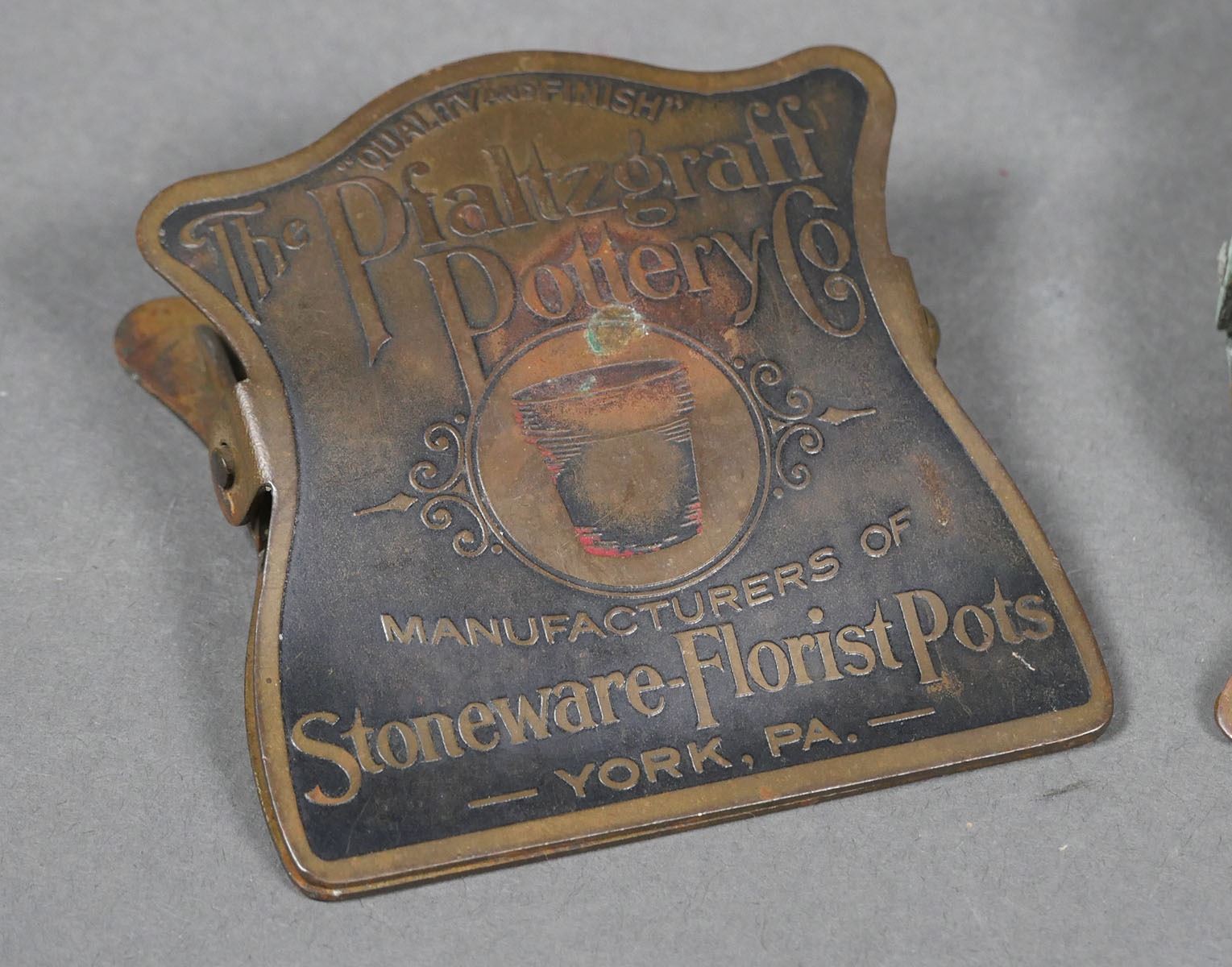 Four antique advertising metal & brass paper binder clips. 1) American Peanut Corp. Norfolk, VA. 2) Krauss Bros. Lumber Company New Orleans, LA. Made by Etching Co. of America. 3) G.W. Todd & Co. Rochester, NY. 4) Pfaltzgraff Pottery Co. York, PA. Made by Premier Metal Etching Co. NY. All clips have age appropriate wear & oxidation. Springs for all the clips work. largest clip measures 2 7/8" in length.