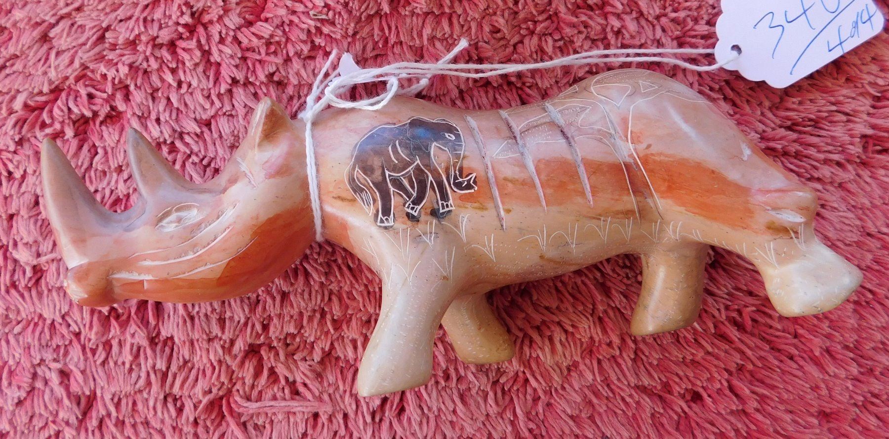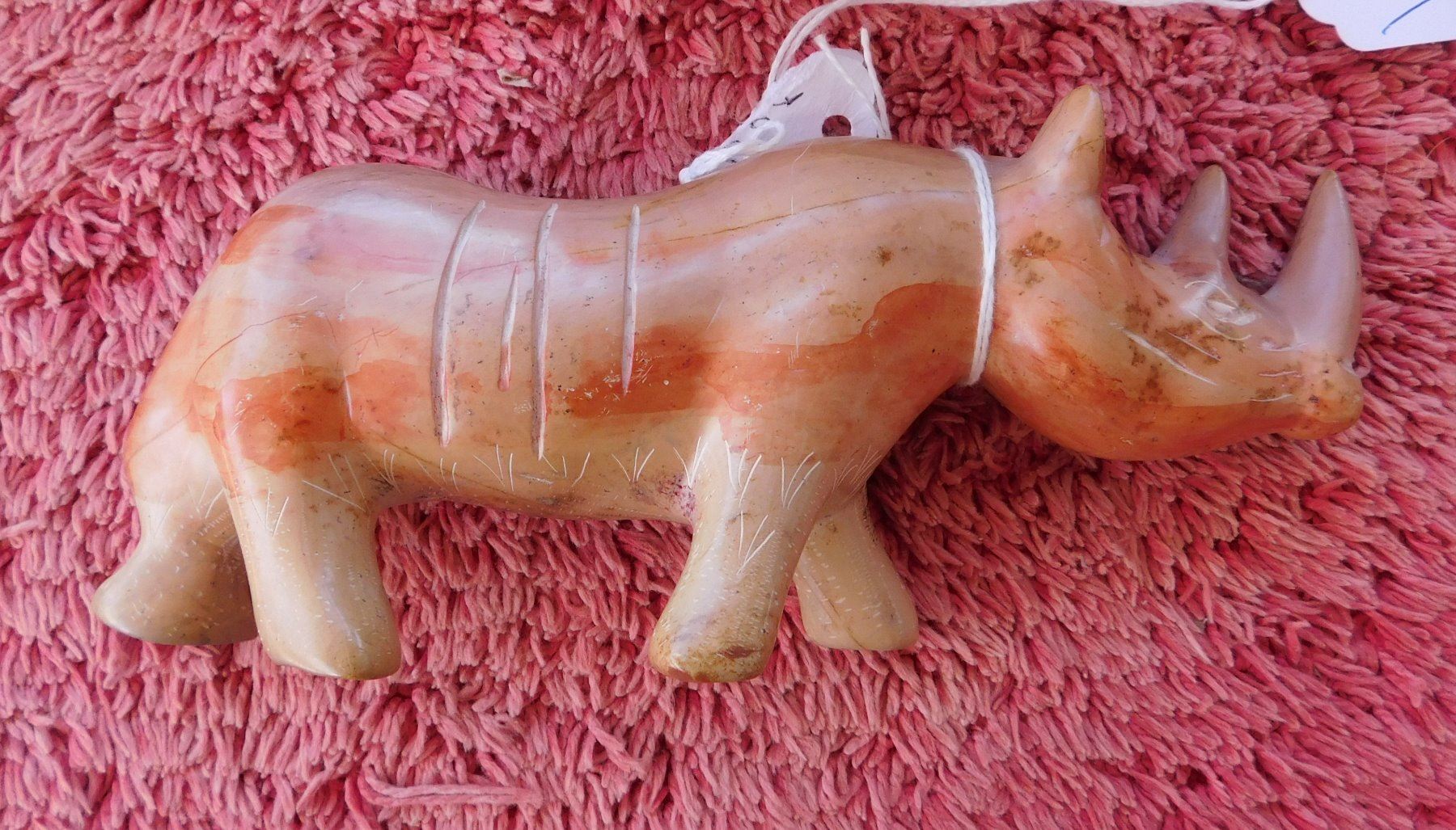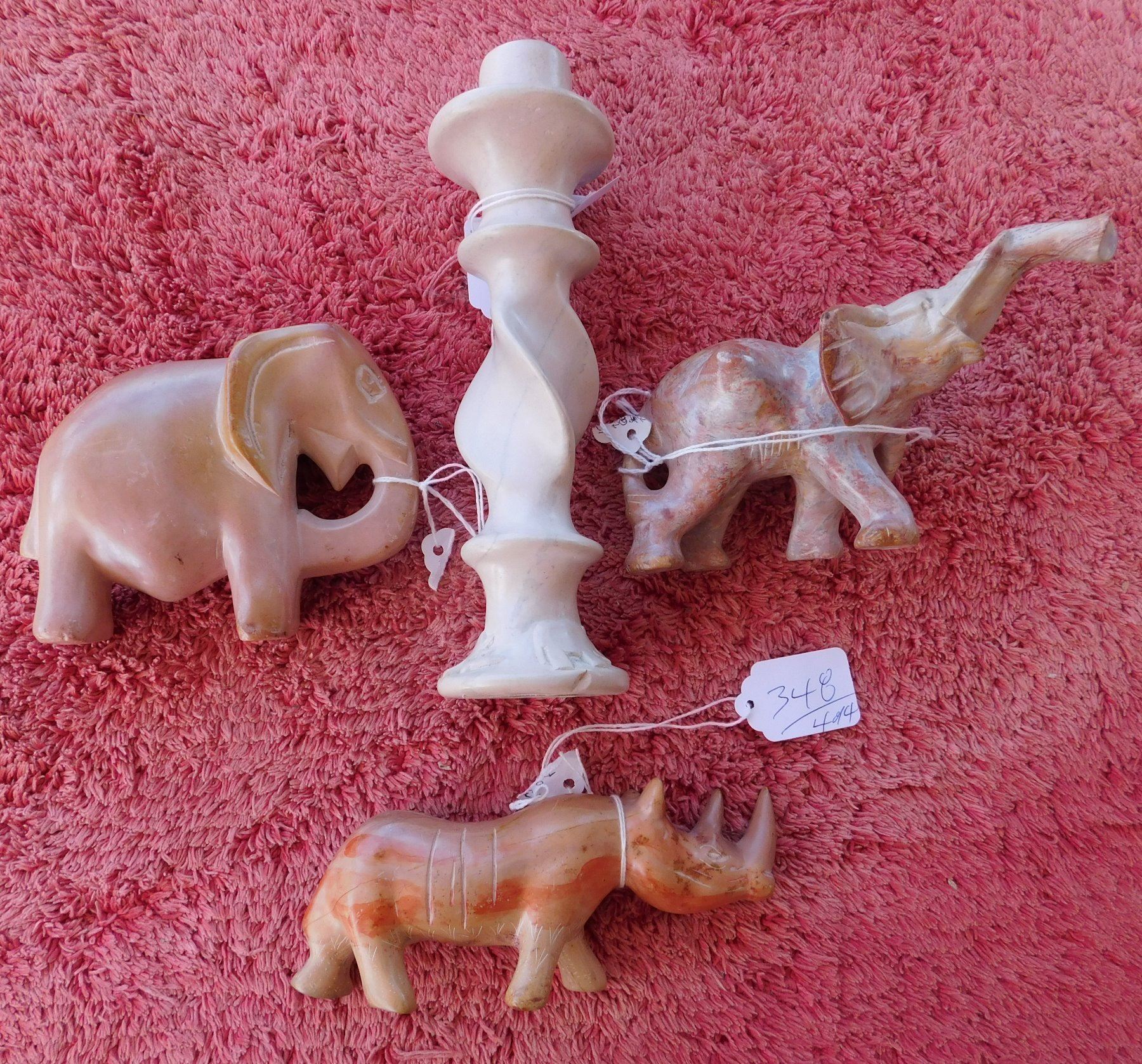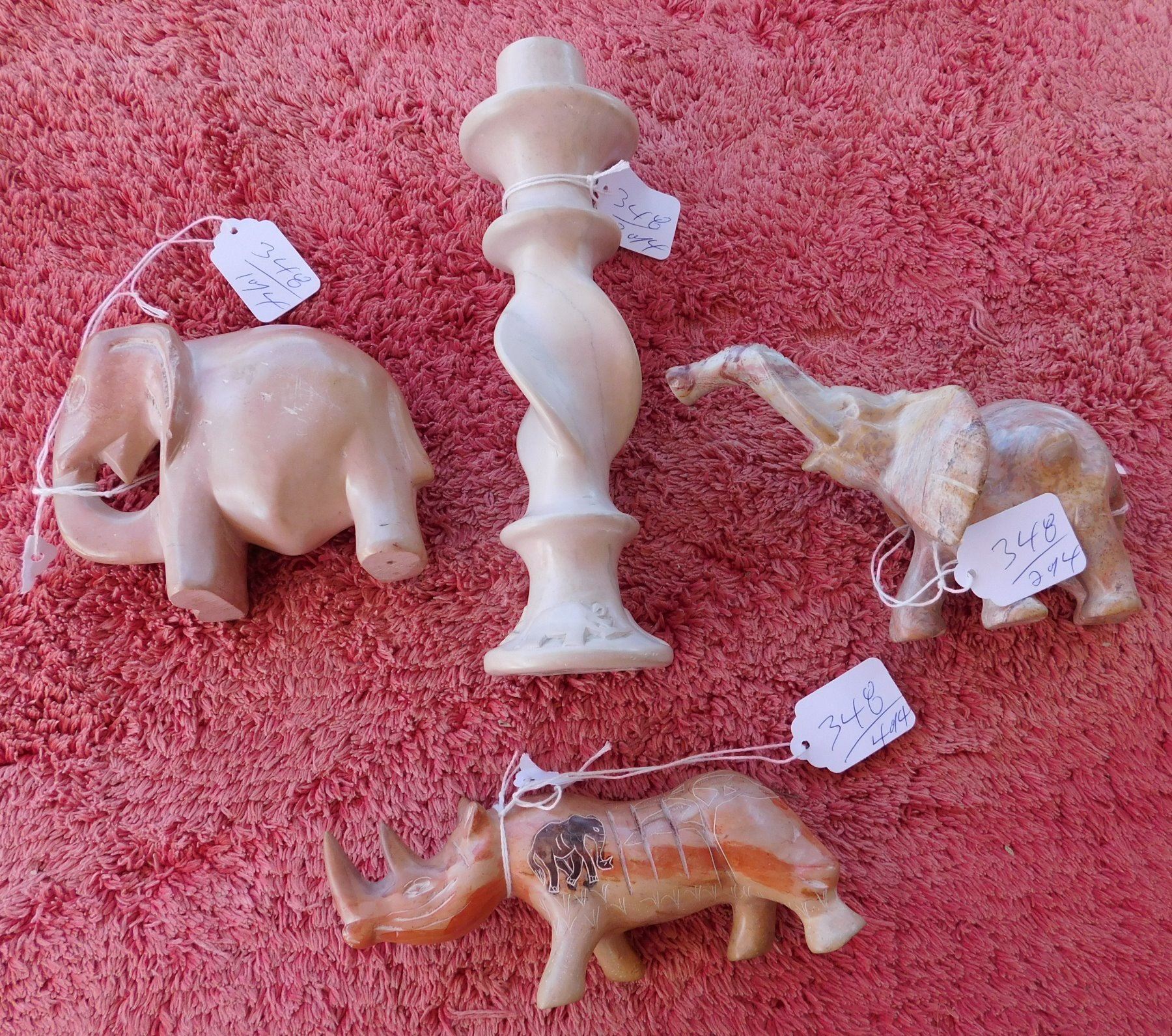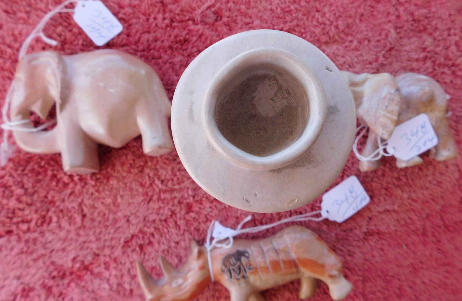 4 African Stone Carvings, c. 1970s. Made of stone, the items measure from 5.25" to 9" long. Africa. Condition: Good, see images. Shipping: $26.50 w/insurance and signature, wrapped.