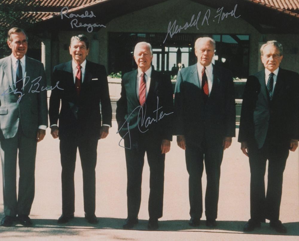 4 American Presidents signed photo autographed by George H.W. Bush, Ronald Reagan Jimmy Carter, Gerald Ford. Custom framed, matted, 11x14 inches. GFA Authenticated