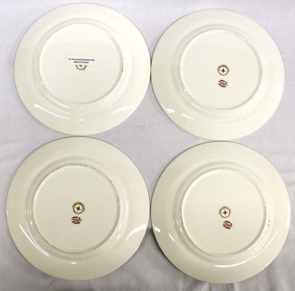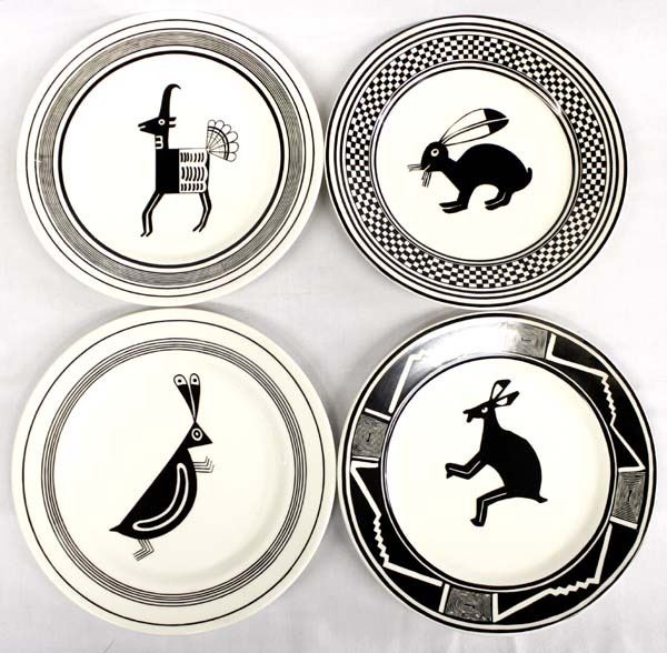 Set of 4 Anasazi Traders Mimbres Designed Black on White Ceramic Decorative Plates, made in Ecuador, measure 11''D, designs include zoomorphic rabbit/goat combo, zoomorphic rabbit/bug combo, rabbit, and zoomorphic antelope/turkey combo, for decorative use only
