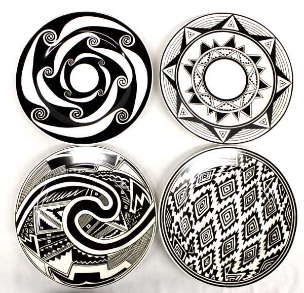 Set of 4 Anasazi Traders Mimbres Designed Black on White Ceramic Decorative Plates, made in Ecuador, measure 11''D, designs are all geometric, for decorative use only