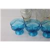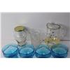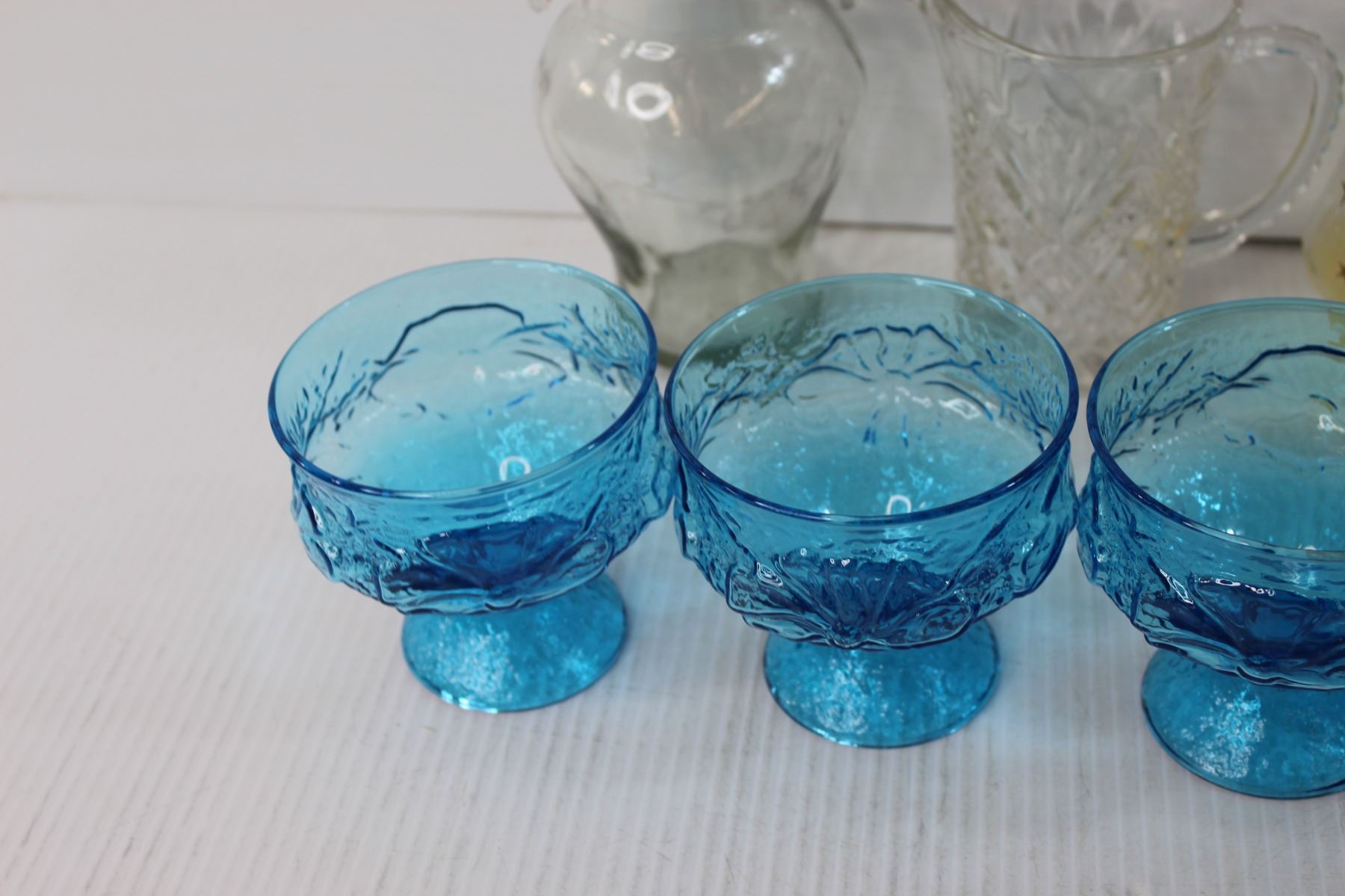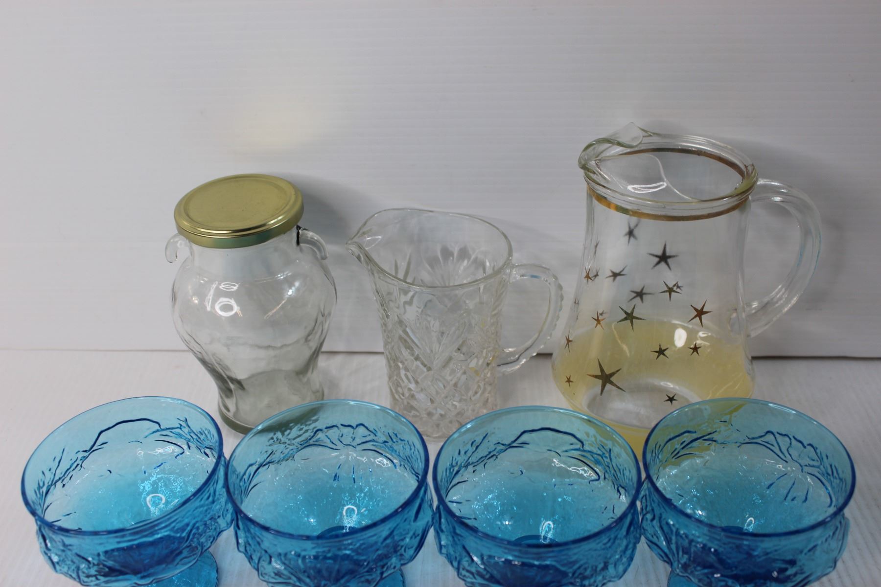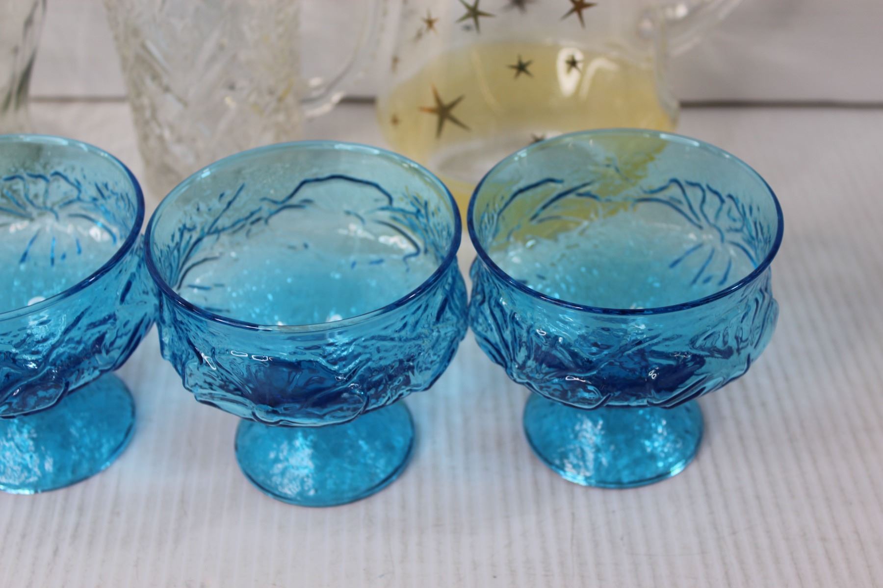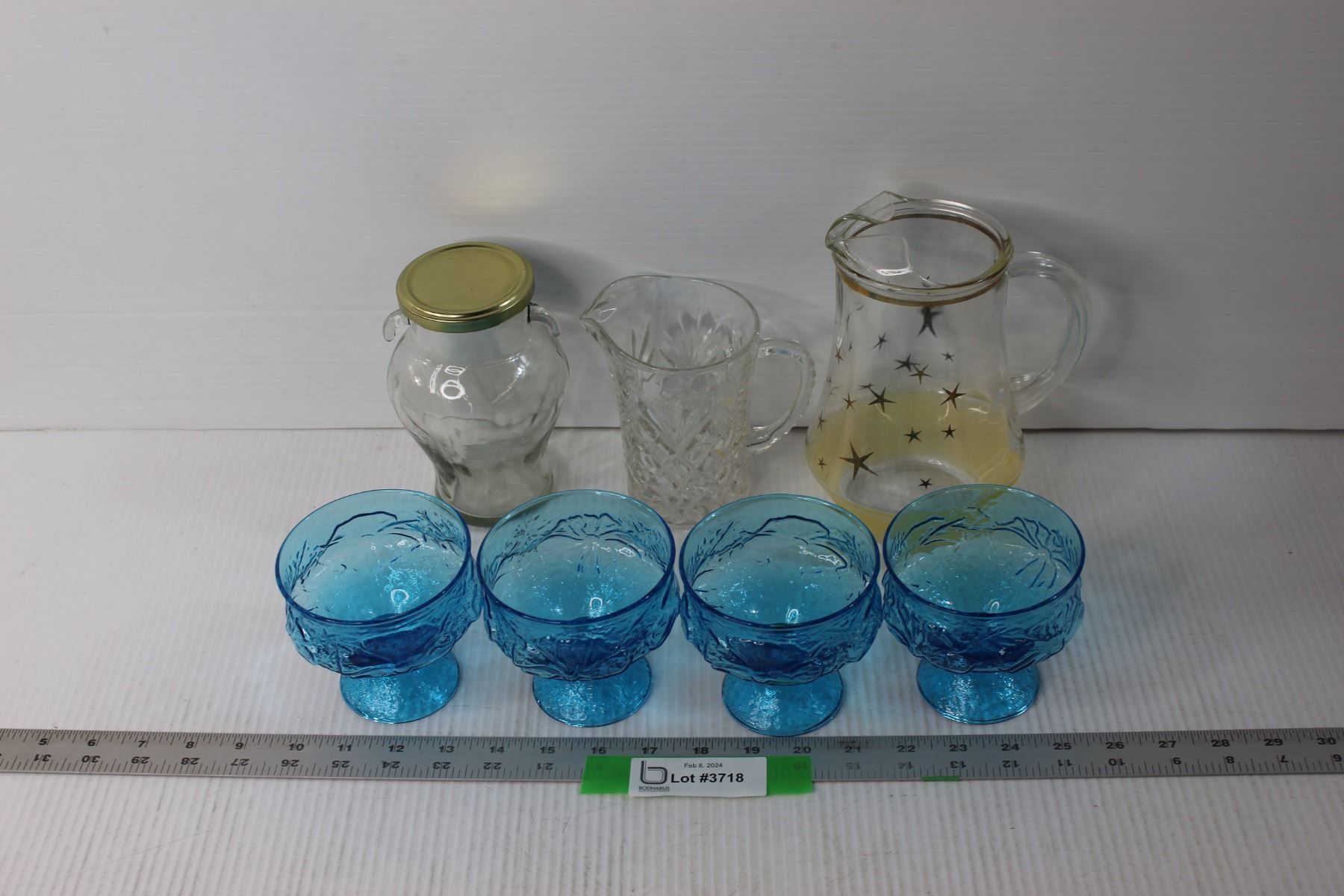 (4) Anchor Hocking Peacock Footed Dessert Cups, Gold Star Pitcher, Misc