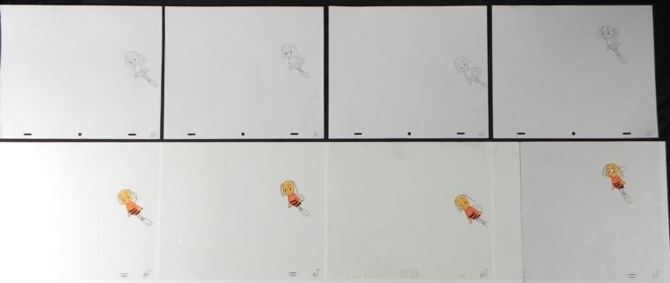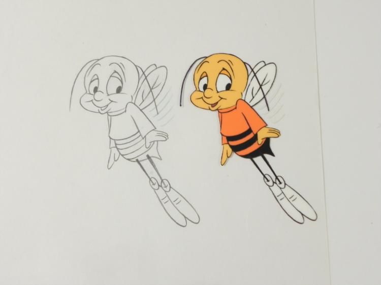 Commercials for Cheerios have been a mainstay of Saturday morning * cartoon programming for many years. They generally depict the mascot * tempting a hapless child or adult with a sparkling bowl of Honey Nut * Cheerios, and their attempts to compete for it. * Offered here are four different original animation cels and drawings * from the production of the Cheerios * commercial. * * The beautiful state of bliss... * Original Animation Cel and * DrawingOriginal "rough" animation drawing in black * and non-photo blue pencil with the notations in * blackSize of cel: 10 1/2" x 12 * 1/2"Overall size is a 12-field drawing that is 10 * 1/2" x 12 1/2"Overall condition: Drawings- Excellent & Cels- Very good; minor creasing to left corner * * * The cel and drawing are ready to be matted and framed. The * animator's notations are located at the bottom of each. *