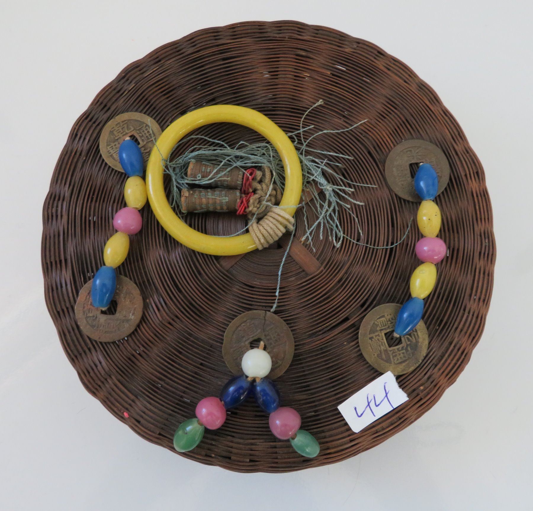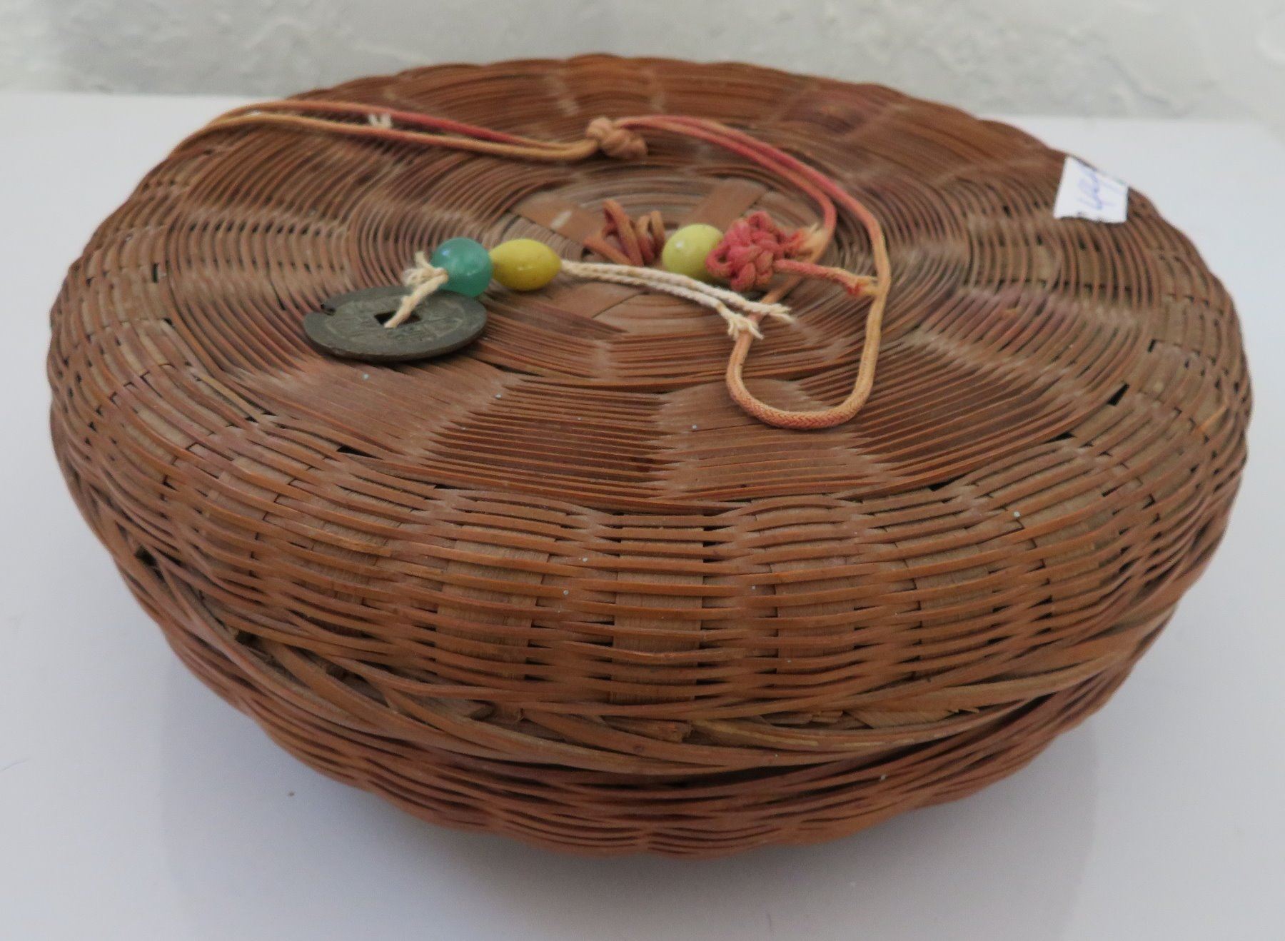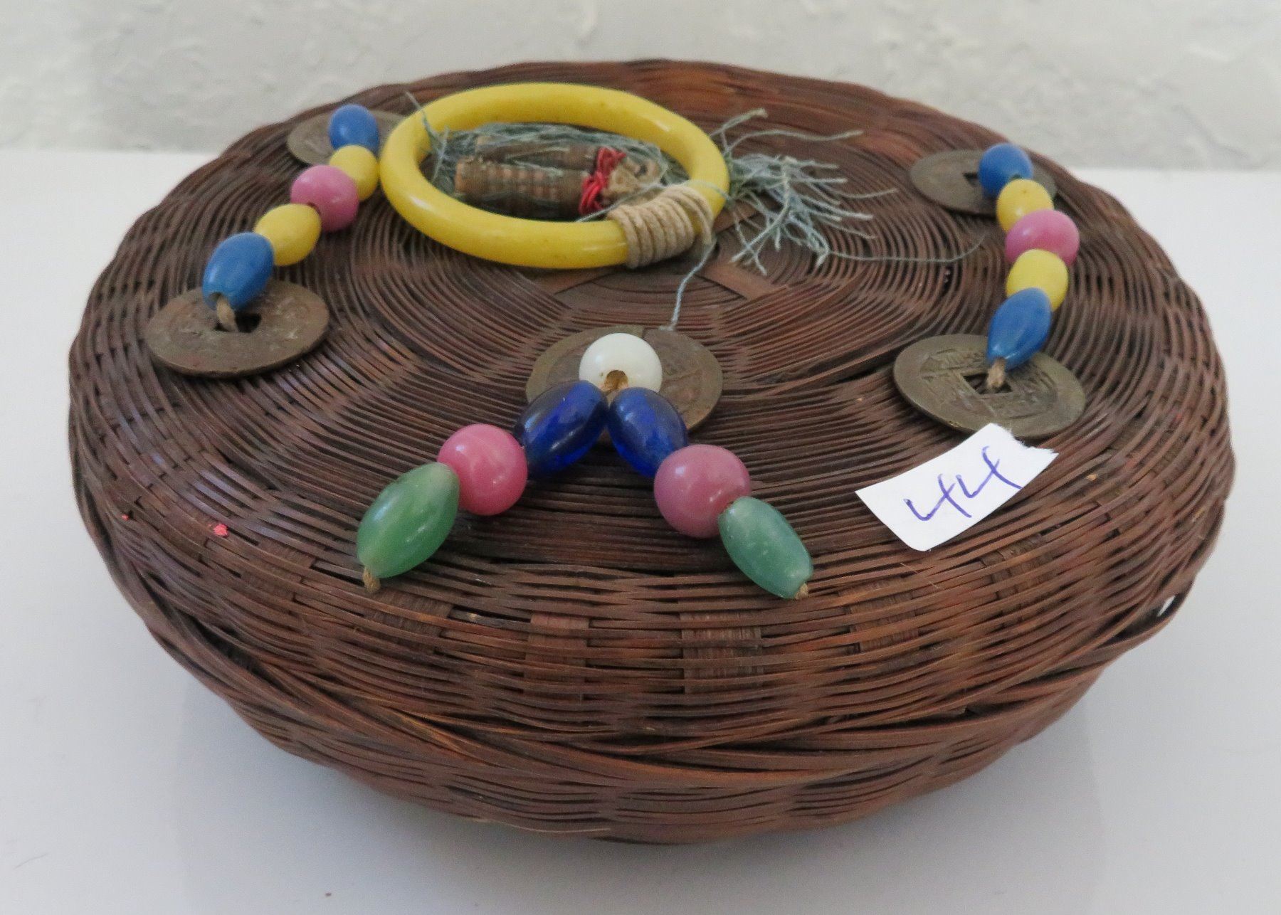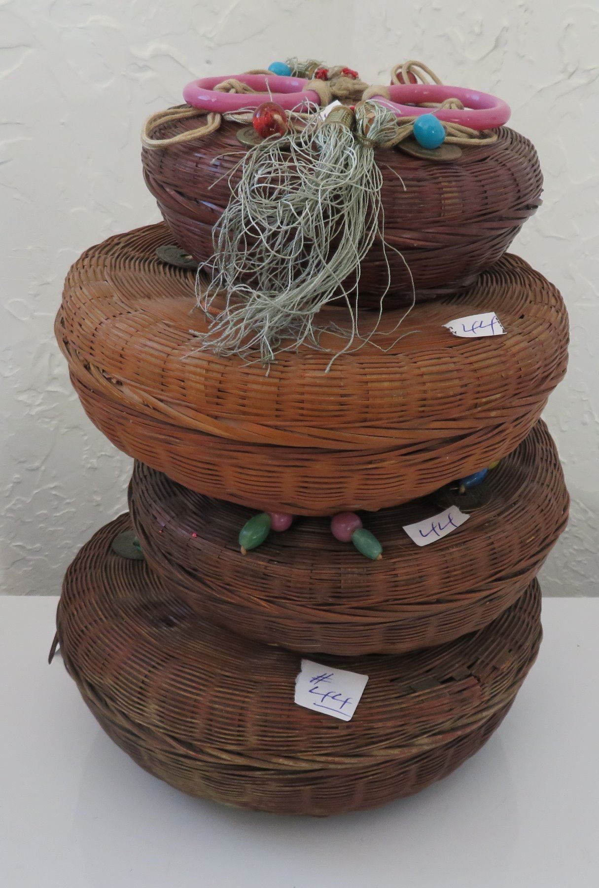 4 Antique Chinese Baskets, Ming dynasty. Made of wood, glass and coins, the largest measures 9" x 3". Chinese sewing baskets. Condition: Some wear, breakage, see images. Shipping: $32.00 w/insurance and signature.