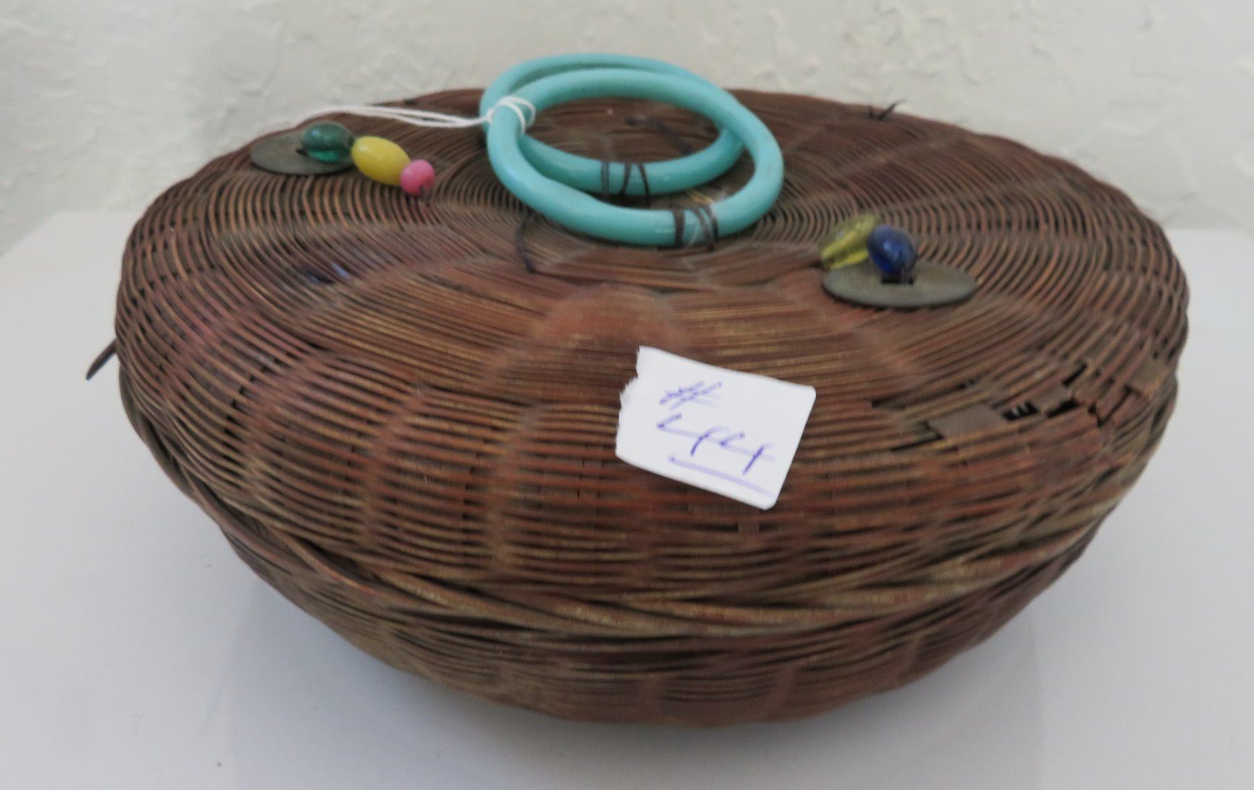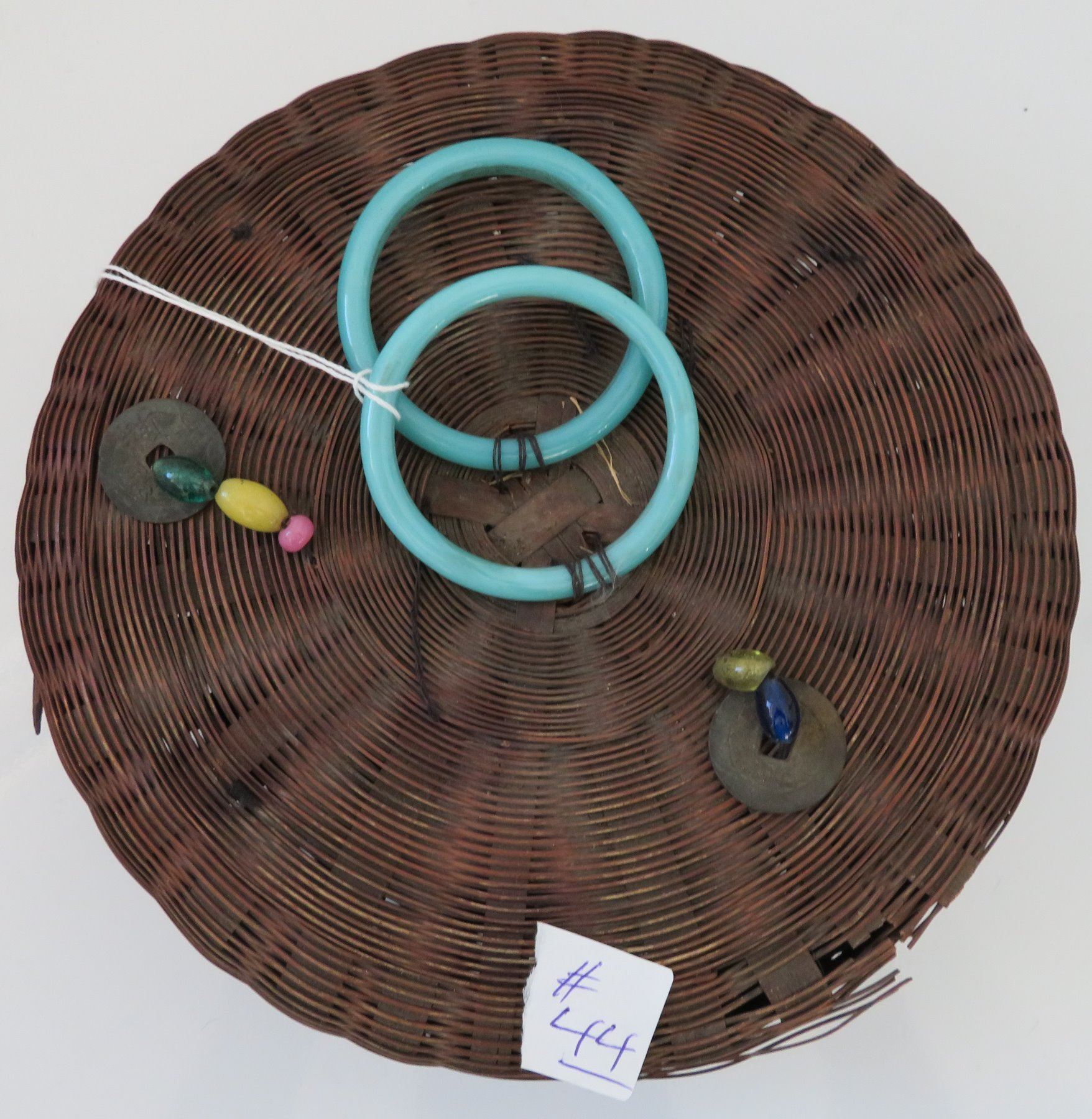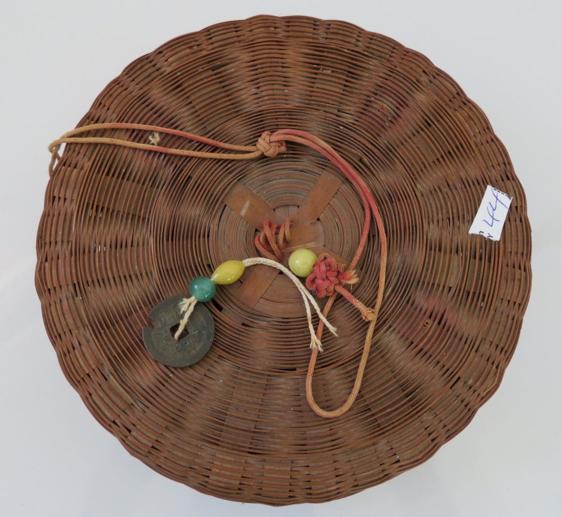 4 Antique Chinese Baskets, Ming dynasty. Made of wood, glass and coins, the largest measures 9" x 3". Chinese sewing baskets. Condition: Some wear, breakage, see images. Shipping: $32.00 w/insurance and signature.