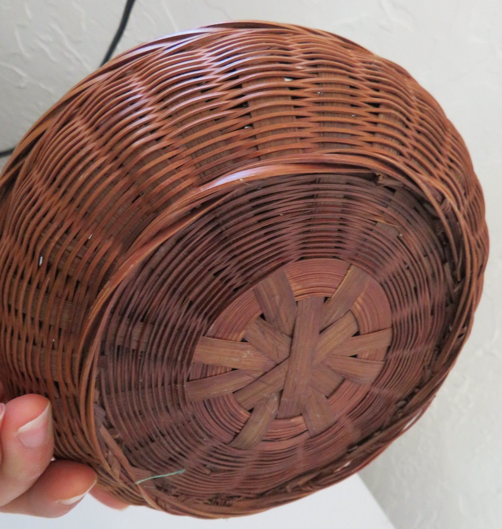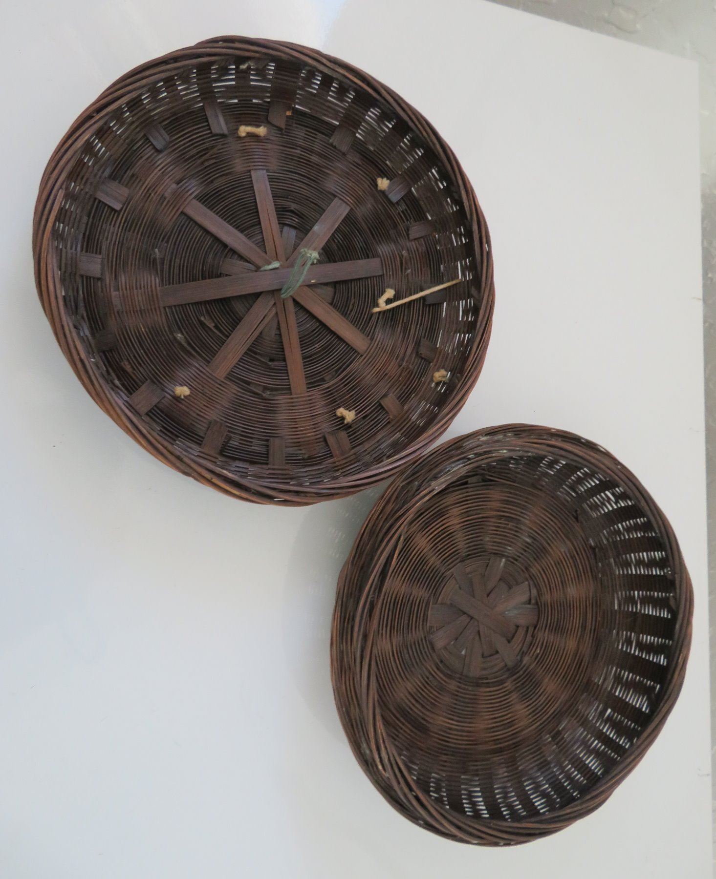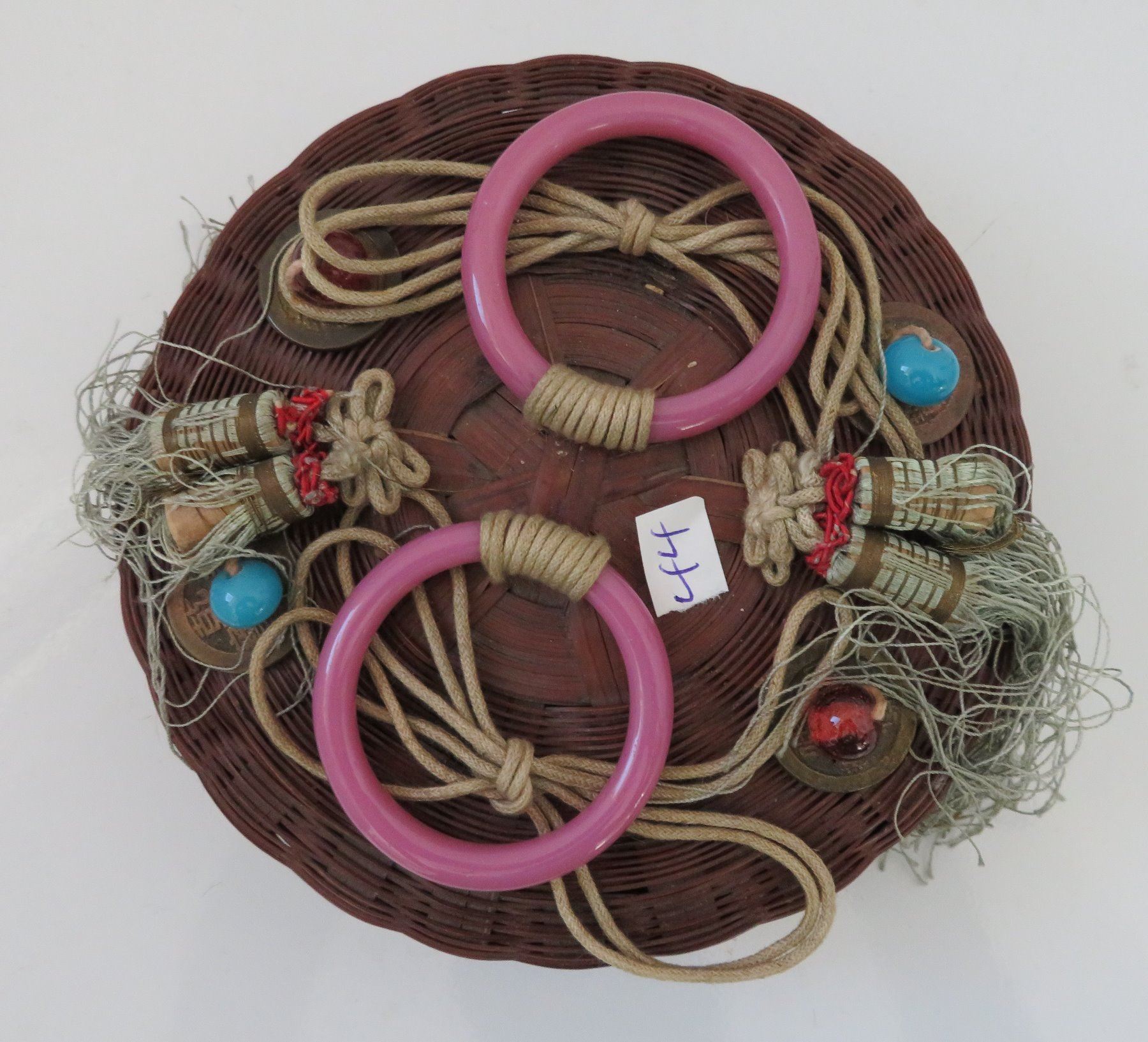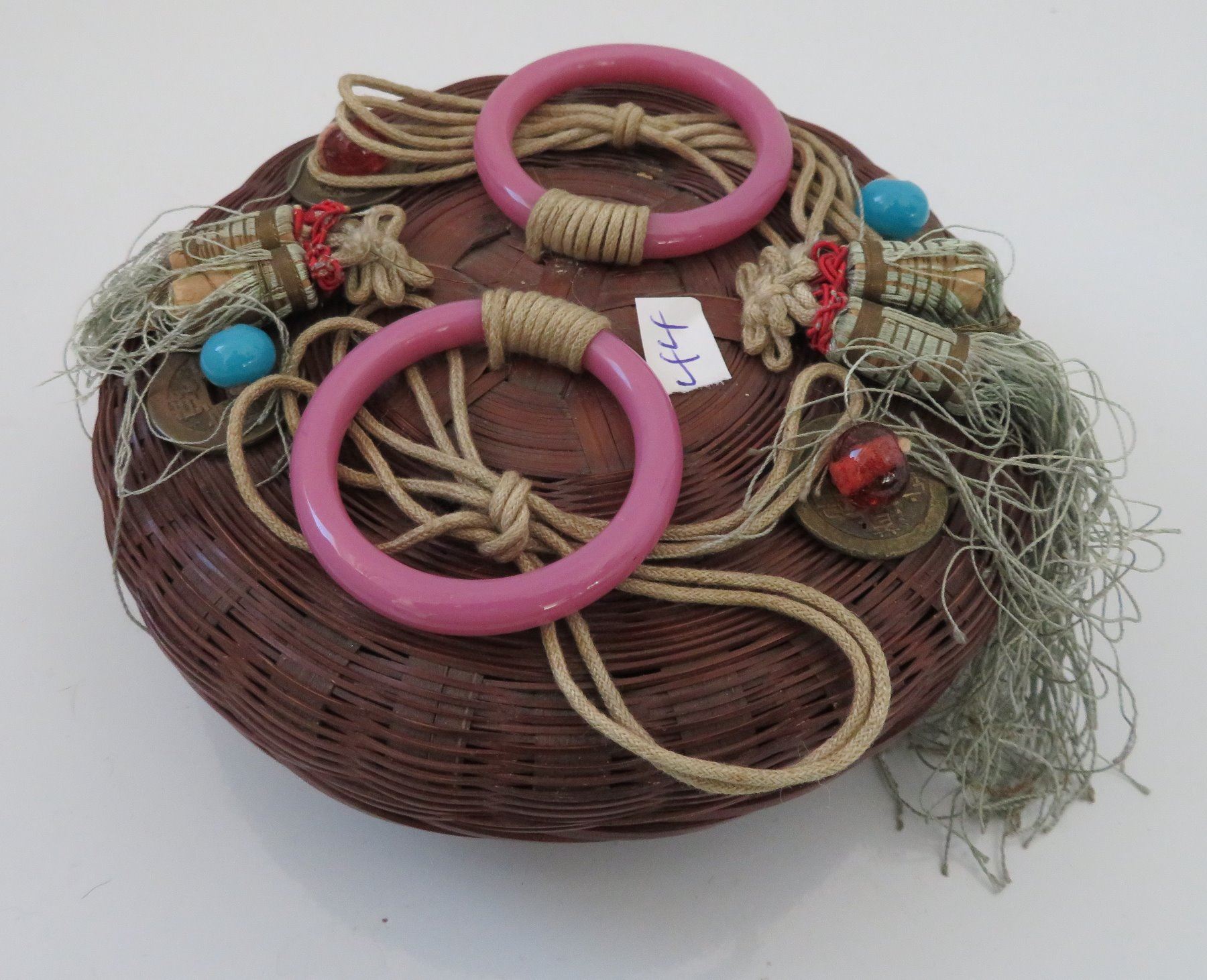 4 Antique Chinese Baskets, Ming dynasty. Made of wood, glass and coins, the largest measures 9" x 3". Chinese sewing baskets. Condition: Some wear, breakage, see images. Shipping: $32.00 w/insurance and signature.