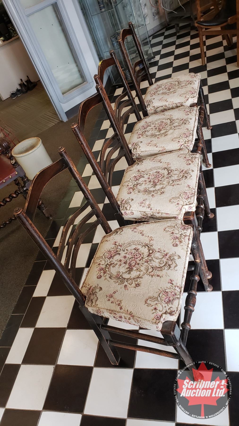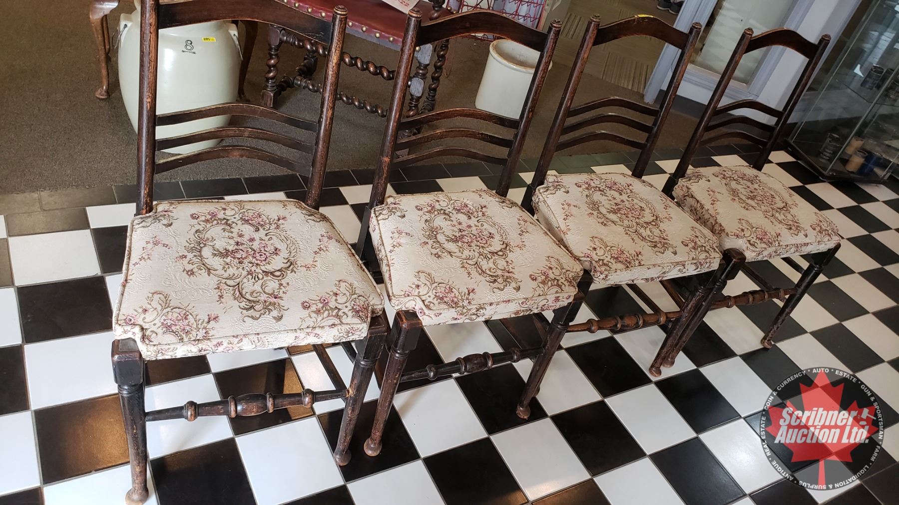 4 Antique Dining Chairs - Upholstered Seats (3 Rung Ladder Back) (37-1/2"H to top of back x 19-1/2"W Seat x 16"D Seat)