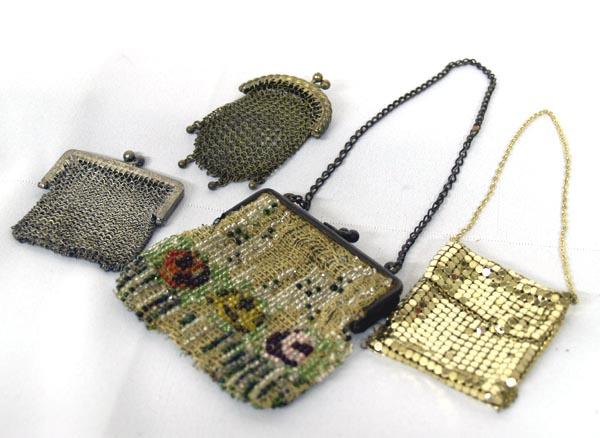 4 Antique Ladies' Coin Purses, 3 Mesh, 1 Beaded. The largest is the gold one-3''x3'' w/o the chain. SHI $20.