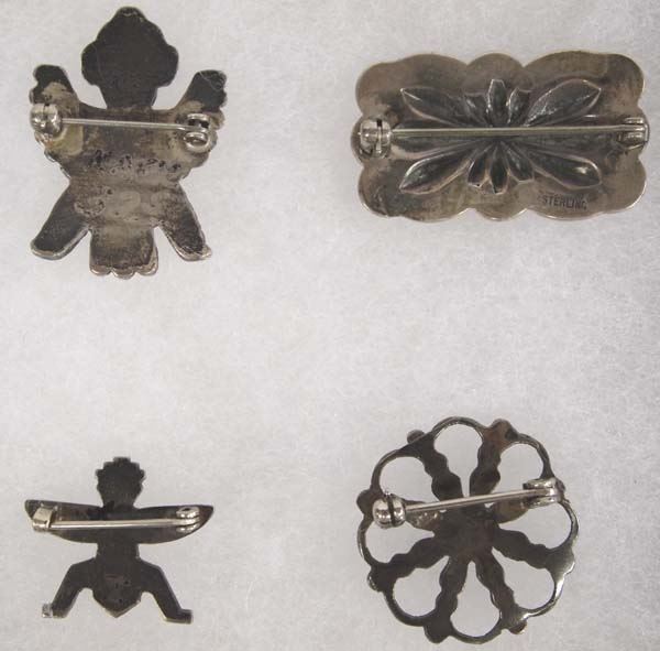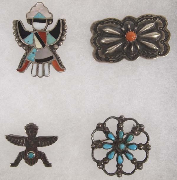 4 Antique Native American Navajo and Zuni Sterling Silver Pins, largest measures 1.25''L x .75''W, includes #1 Navajo Sterling Silver Coral Concho stamped sterling, #2 Zuni Sterling Bisbee Turquoise Petit Point, #3 Zuni Sterling Turquoise Inlay Knifewing Traditional, #4 Zuni Sterling Turquoise Knifewing, 14.21g in total wt.