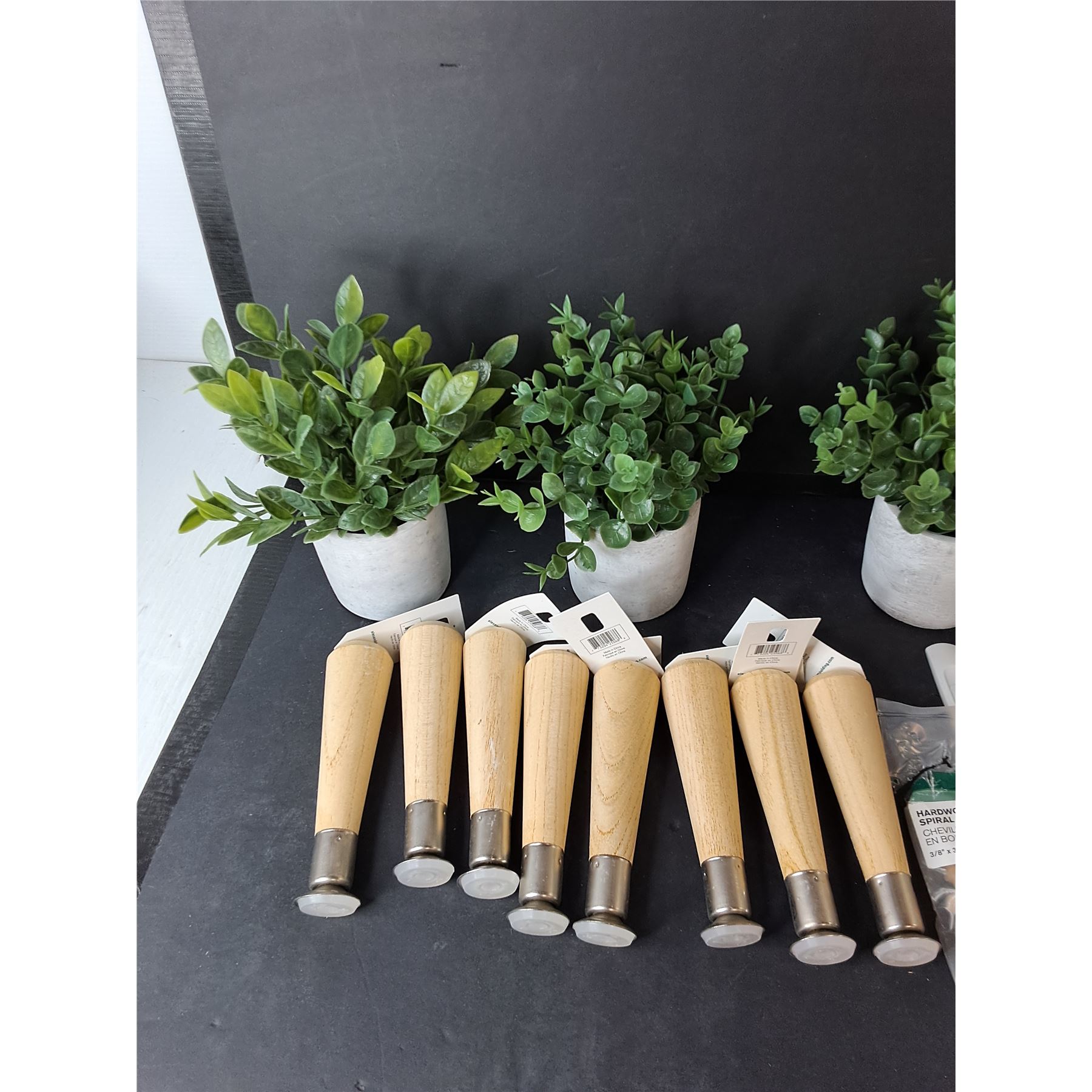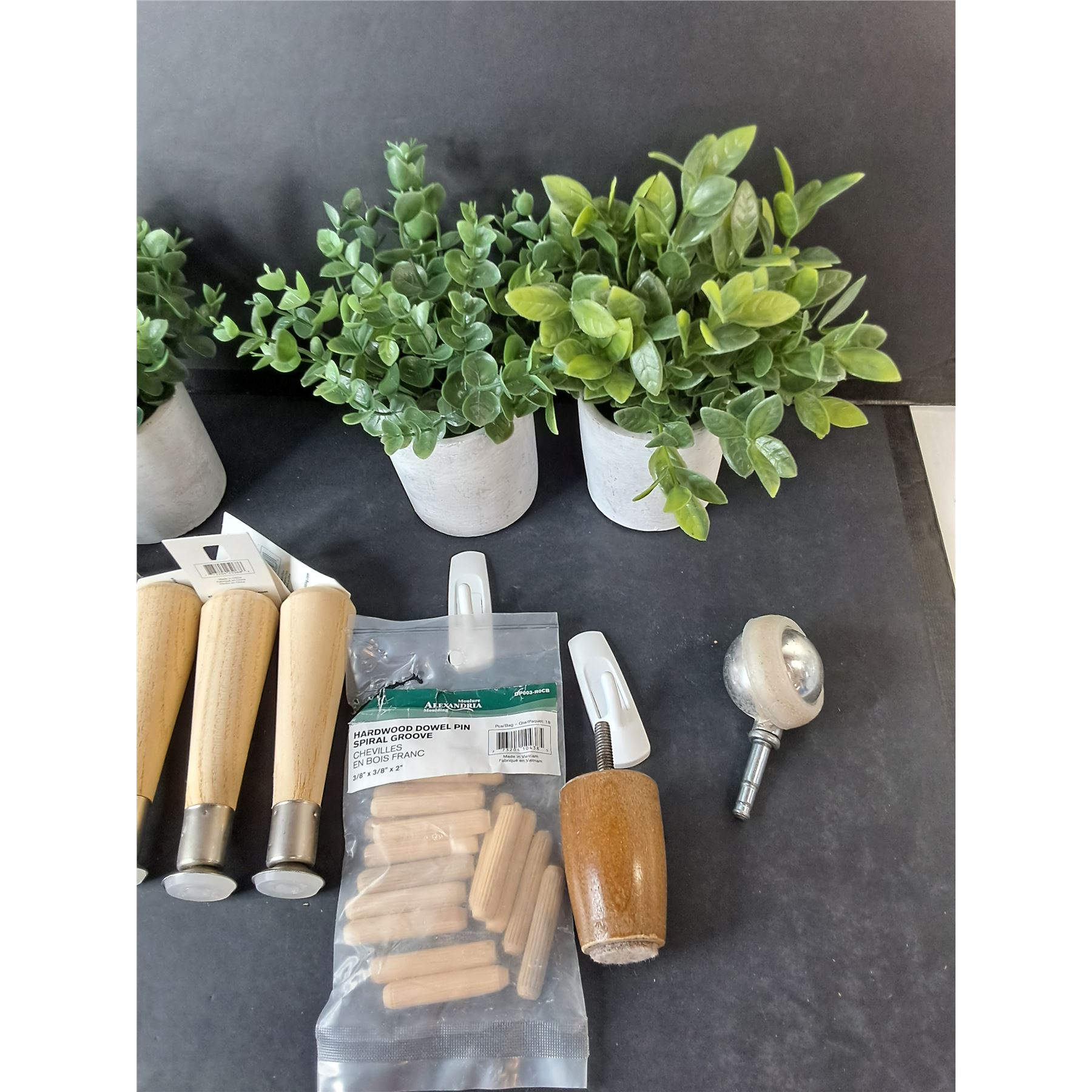 (4) Artificial Potted Plants, (9) Wooden Table Legs Up to 5.5", Dowel Pins, Misc.