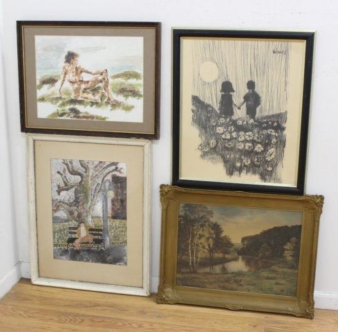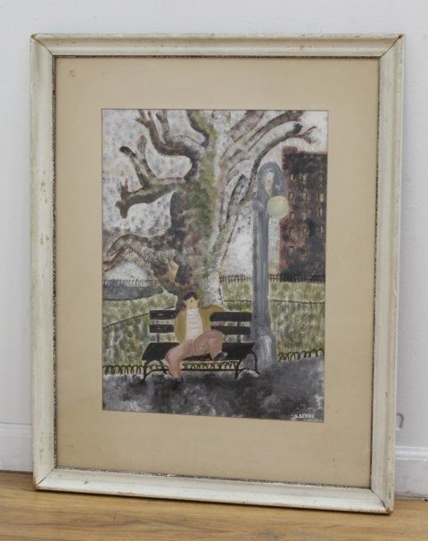 One watercolor, nude, unsigned, approx. 14" H x 19" W sight, 20" H x 25" W framed; one oil on paper, man on bench, signed S. Levine, lower right, approx. 19 1/2" H x 14 1/2" W sight, 30" H x 23" W framed; one print, two children, signed