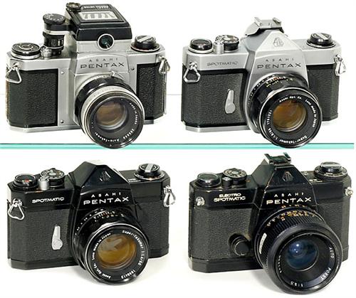4 Kameras Asahi Pentax SLR Asahi Optical Co. 1) "SB 2", 1959. Mit Auto Takumar 2/55 mm, Verschluß 1-1/1000 Sek., mit aufgesetztem Belichtungsmesser, zeigt an! (3/3) - 2-3) 2 x "SP", 1964. 1 x Chrom, 1 x schwarz, 1 x Super-Takumar 1,4/50 mm, 1 x Super-Takumar 1,8/55 mm, Belichtungsmesser kann nicht geprüft werden, sonst (3+/3). - Und: 4) "ES", Electro Spotmatic, 1971, mit Objektiv Porst 3,5/35 mm Objektiv und Karton ES II, nicht geprüft. (3-/-)