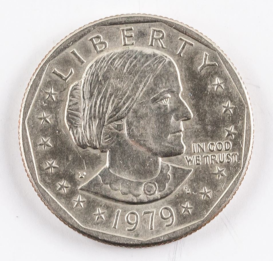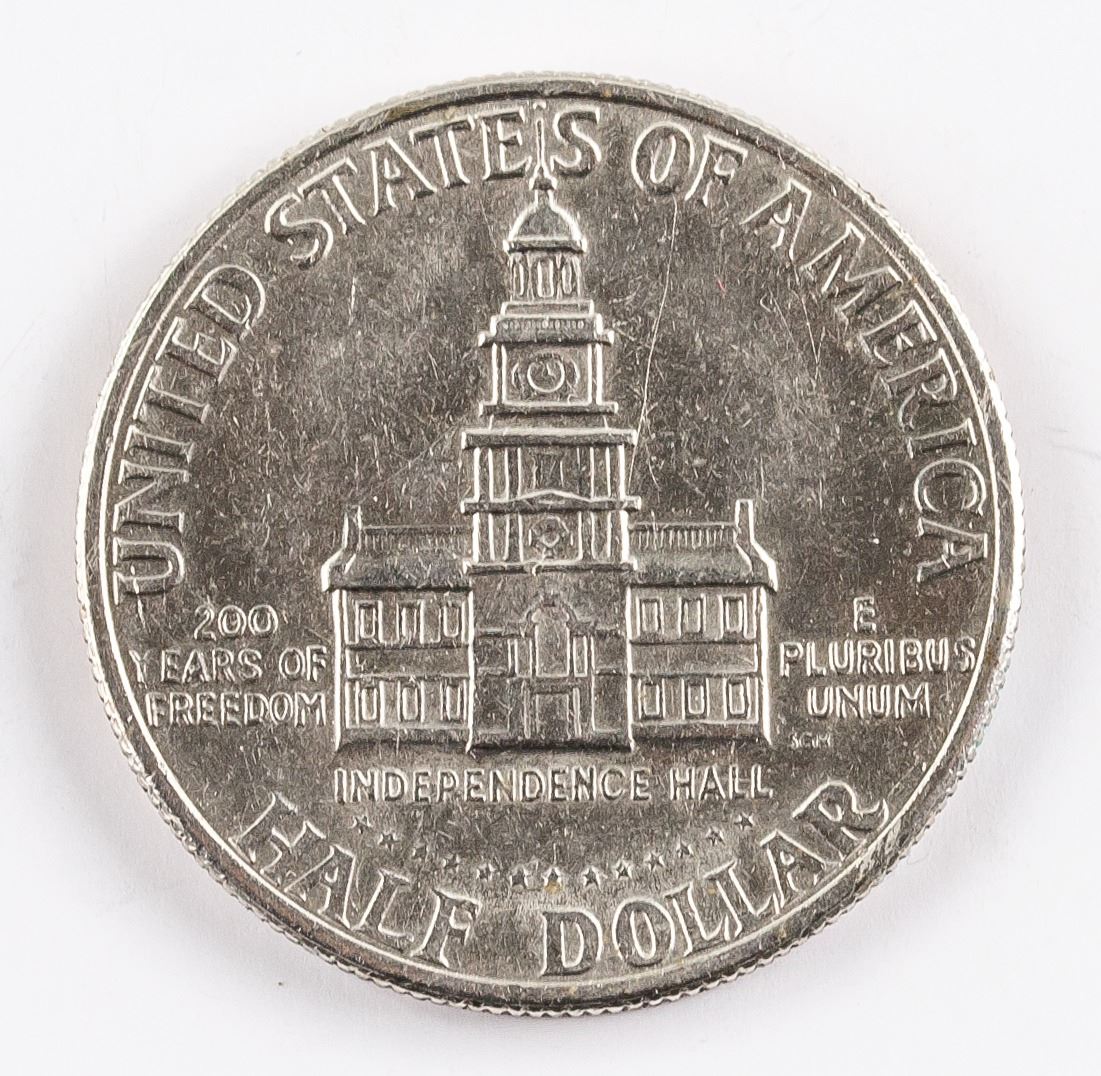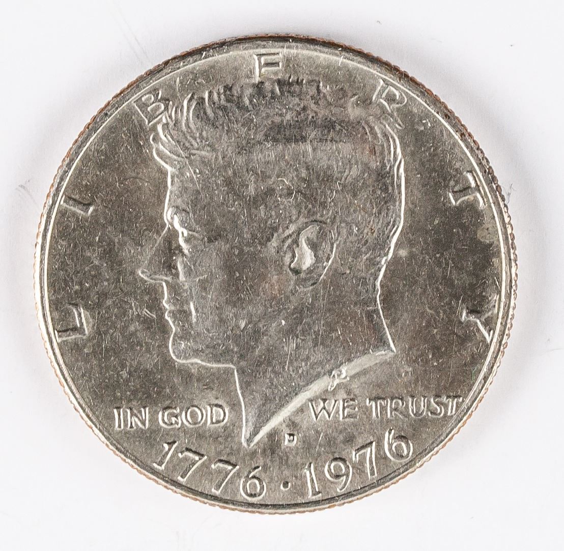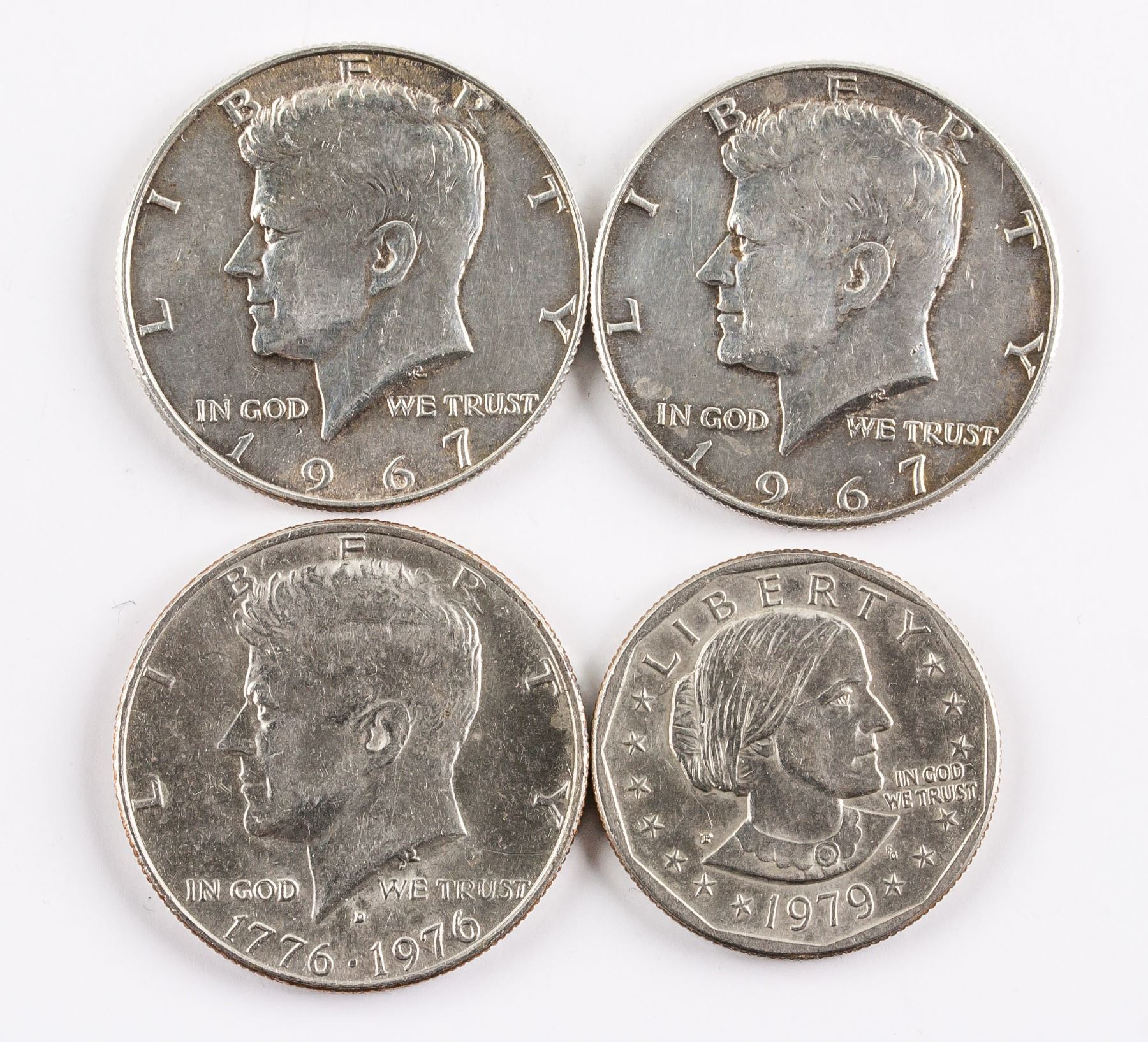 Four (4) assorted United States coins; of 2 1967 Half Dollar silver (.400) coins, KM-202a; 1 1976 copper-nickel plated copper coin, KM-205, commemorative issue Bicentenary of the United States Declaration of Independence; 1 1979 One Dollar Susan B Anthony copper-nickel clad copper coin, KM-207; Diameter: 30.65 mm - 26.49 mm 42.128 grams total, 11.231 grams each