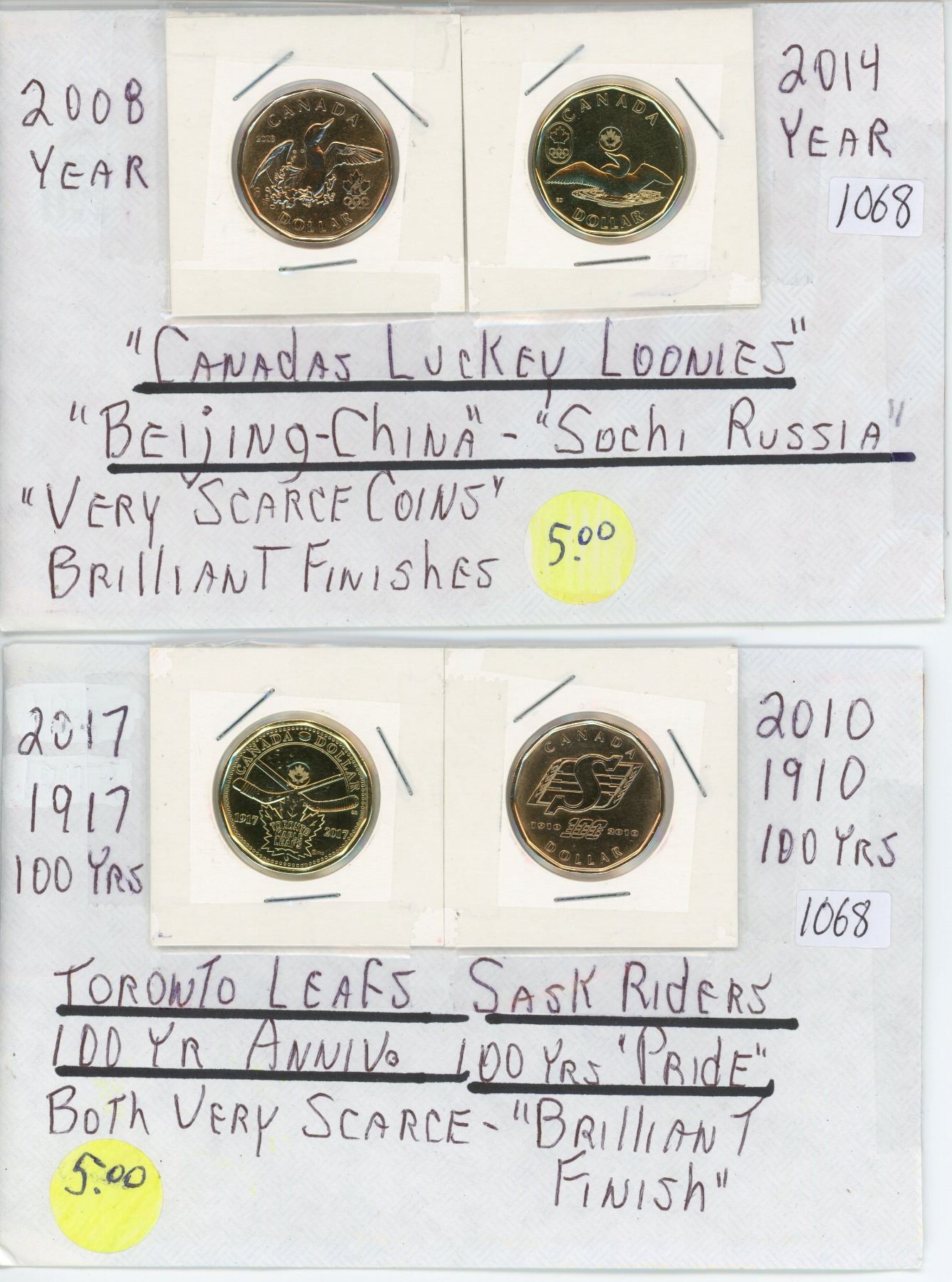 4 Assorted, Canadian Loonies (1 dollar) - 2008, 2014, 2017, 2010