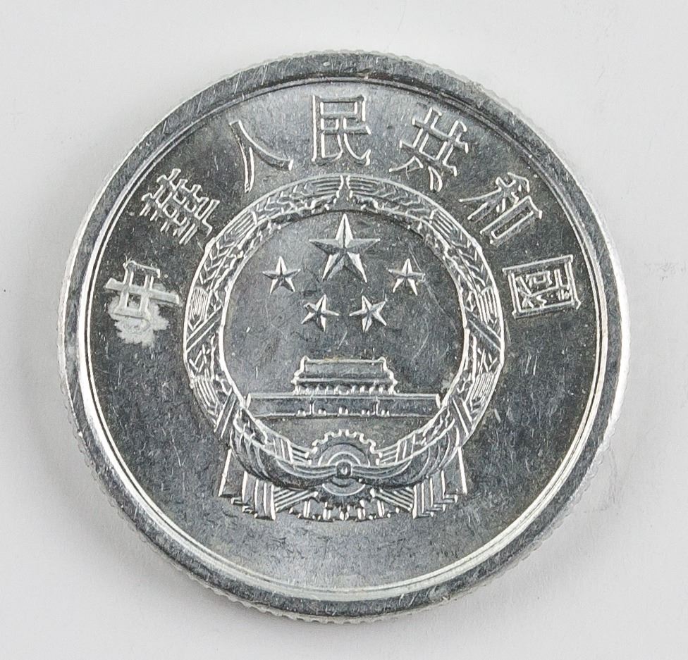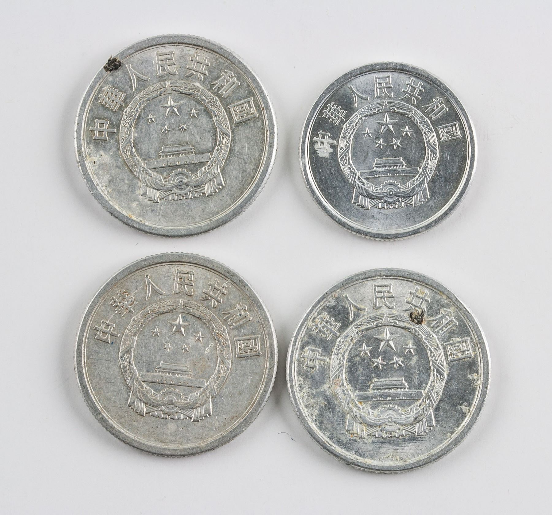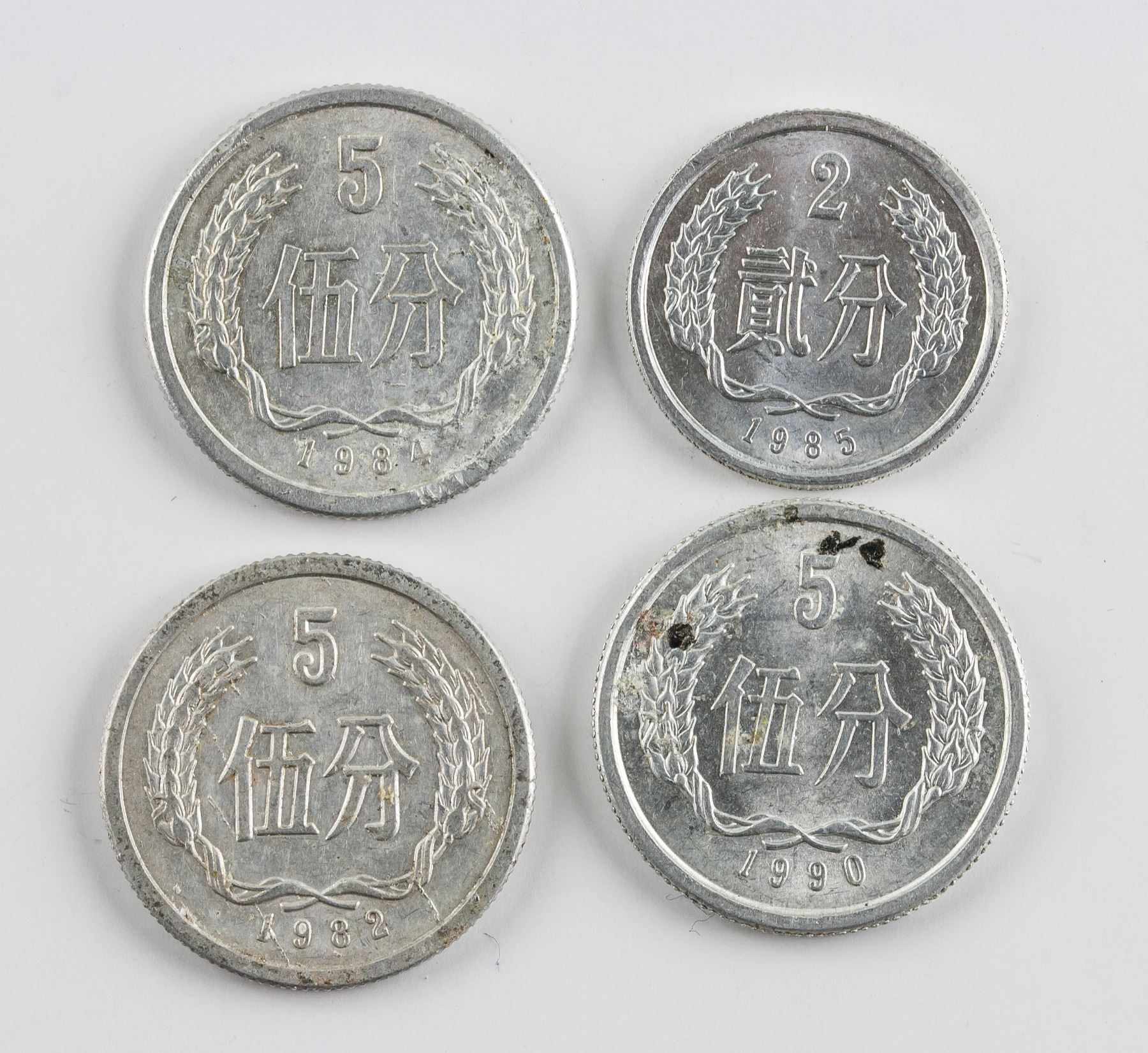 4 assorted Chinese aluminum coins; of 3 Five Cents coins (1982, 1984, 1990), KM-3; of 1 1985 Two Cents coin, KM-2; obverse engraved wreath, lettering year and value; reverse engraved national emblem; reeded edge; Diameter: 23.96 mm - 20.99 mm, 5.978 grams